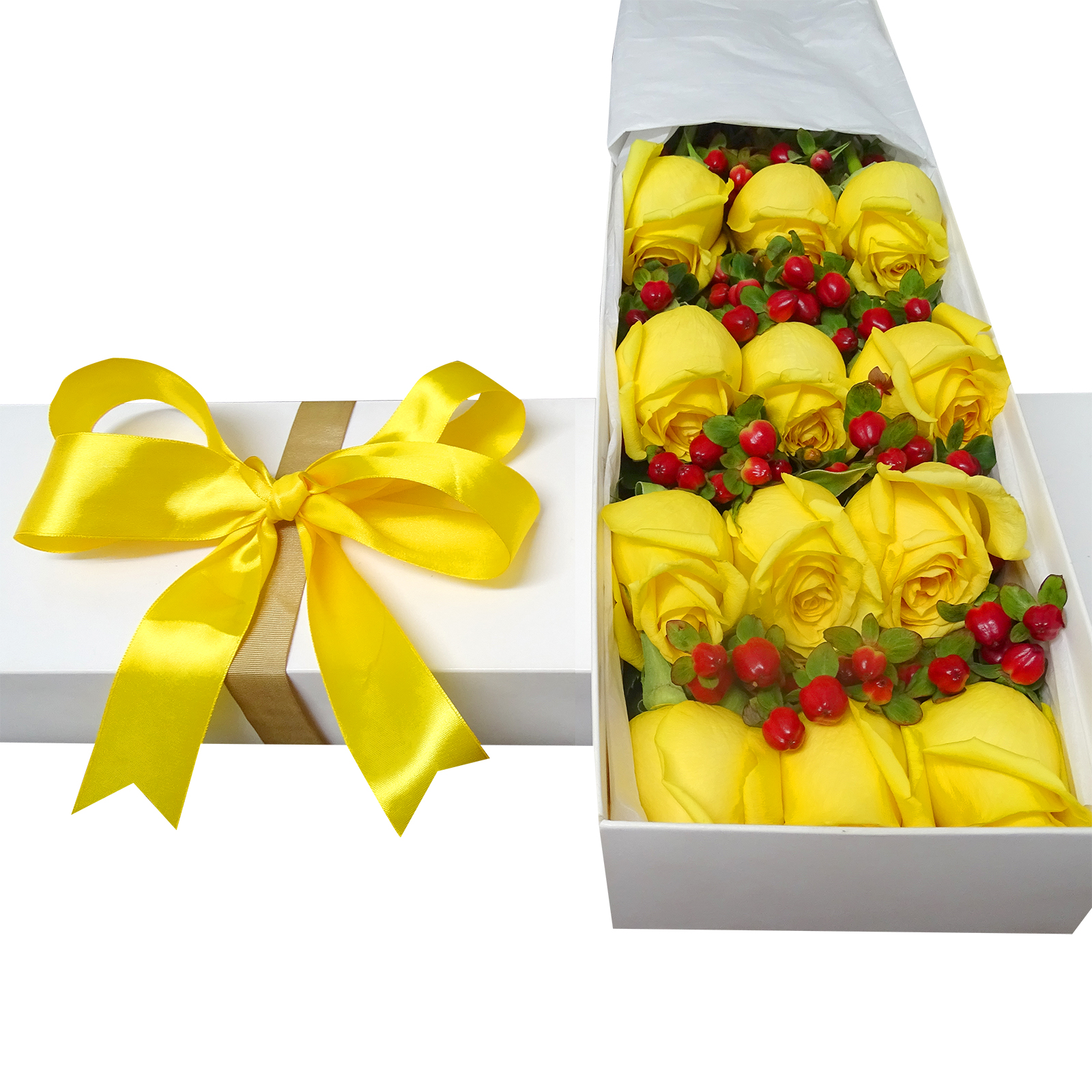• Sorpréndela con esta espectacular caja de 12 bellas Rosas amarillo Ecuatorianas con tallo largo desespinadas,  acompañadas por 10 Hypericum rojo. Cada Rosa va insertada en una bombilla con agua (Aquapick) para su hidratación y mantención durante el traslado, van envueltas en un fino y sedoso papel mantequilla, con un sachet de preservante floral para su durabilidad, un instructivo para el cuidado de las flores y un refinado sobre con una tarjeta para mensajes. La caja que abarca las Rosas son de elegantes terminaciones de cartón color blanco, sujetada con una hermosa cinta satín.