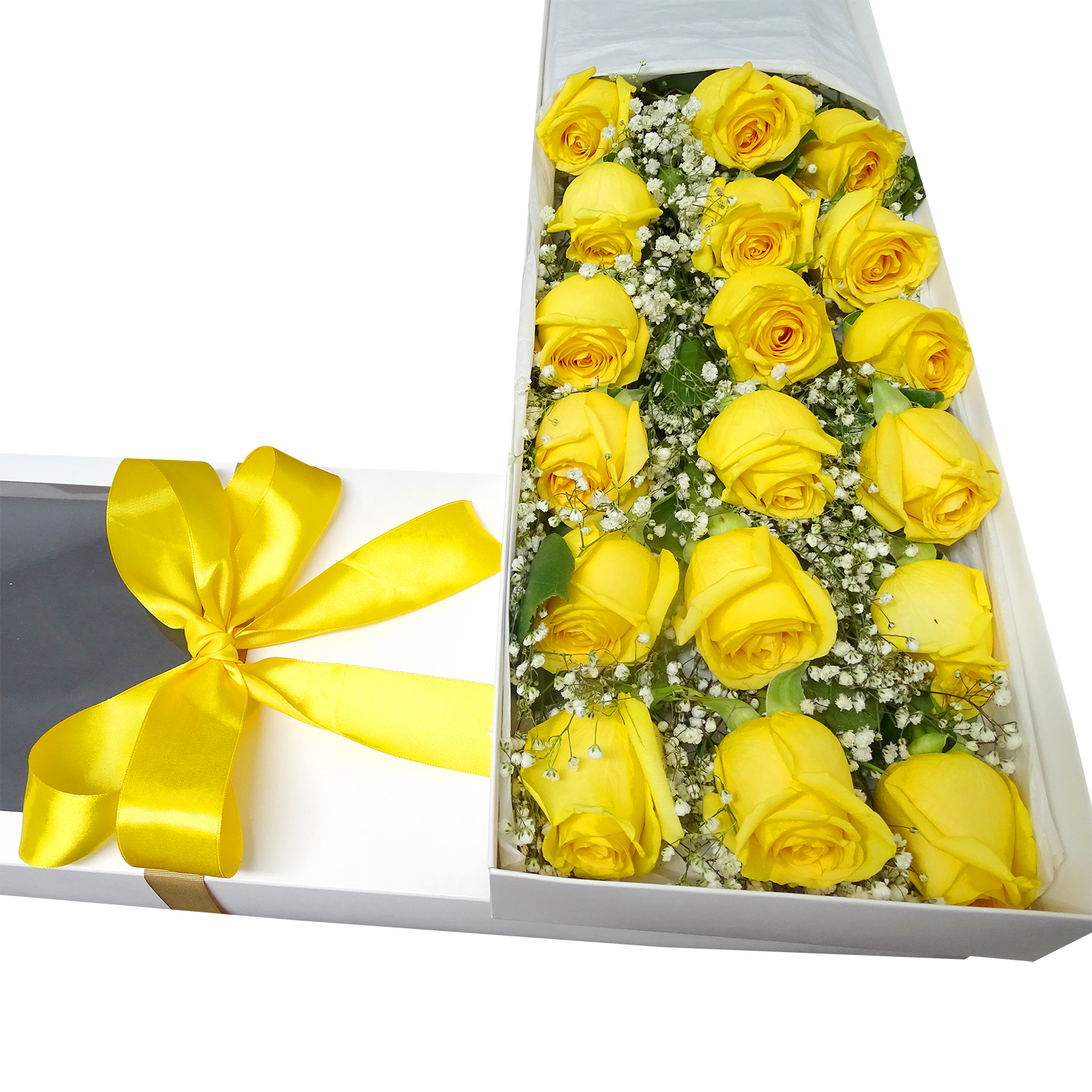 - Sorpréndela con esta espectacular caja de 18 bellas Rosas amarillas Ecuatorianas con tallo largo desespinadas, acompañada de 3 varas de Gypsophilia que realza su belleza. Cada Rosa va insertada en una bombilla con agua (Aquapick) para su hidratación y mantención durante el traslado, van envueltas en un fino y sedoso papel mantequilla blanco, con un sachet de preservante floral para su durabilidad, un instructivo para el cuidado de las flores y un refinado sobre con una tarjeta para mensajes. La caja que abarca las Rosas son de elegantes terminaciones de cartón color blanco, sujetada con una hermosa cinta santín.
