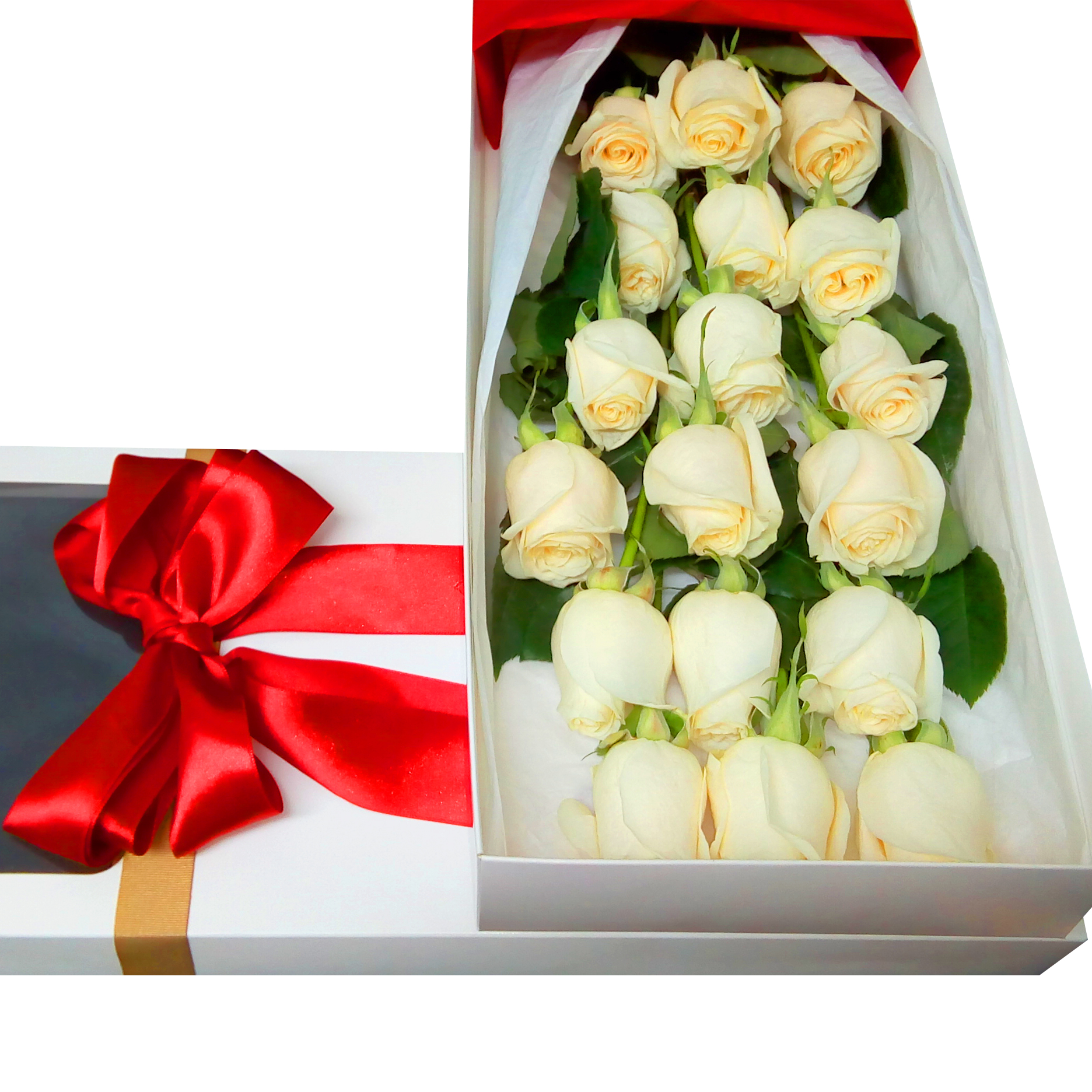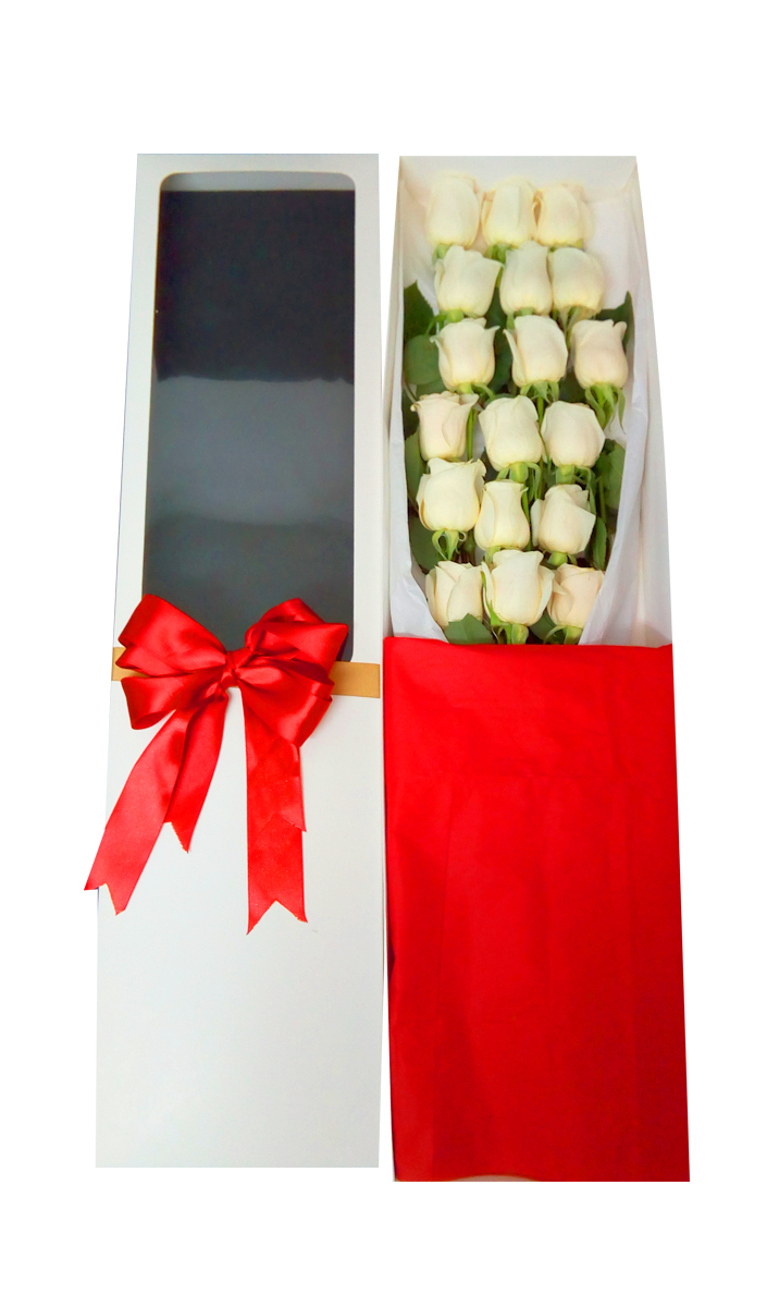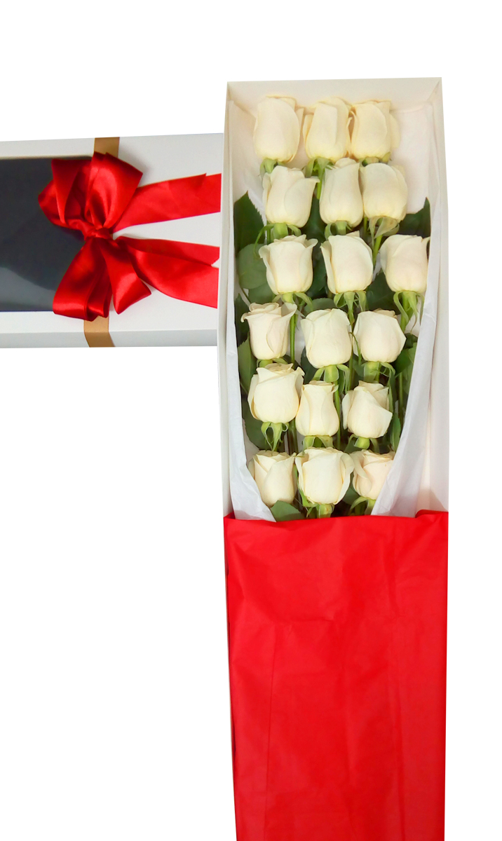 - Sorpréndela con esta espectacular caja de 18 bellas Rosas blanco Ecuatorianas con tallo largo desespinada. Cada Rosa va insertada en una bombilla con agua (Aquapick) para su hidratación y mantención durante el traslado, van envueltas en un fino y sedoso papel mantequilla blanco, con un sachet de preservante floral para su durabilidad, un instructivo para el cuidado de las flores y un refinado sobre con una tarjeta para mensajes. La caja que abarca las Rosas son de elegantes terminaciones de cartón color blanco, sujetada con una hermosa cinta santín.