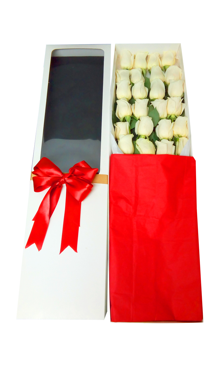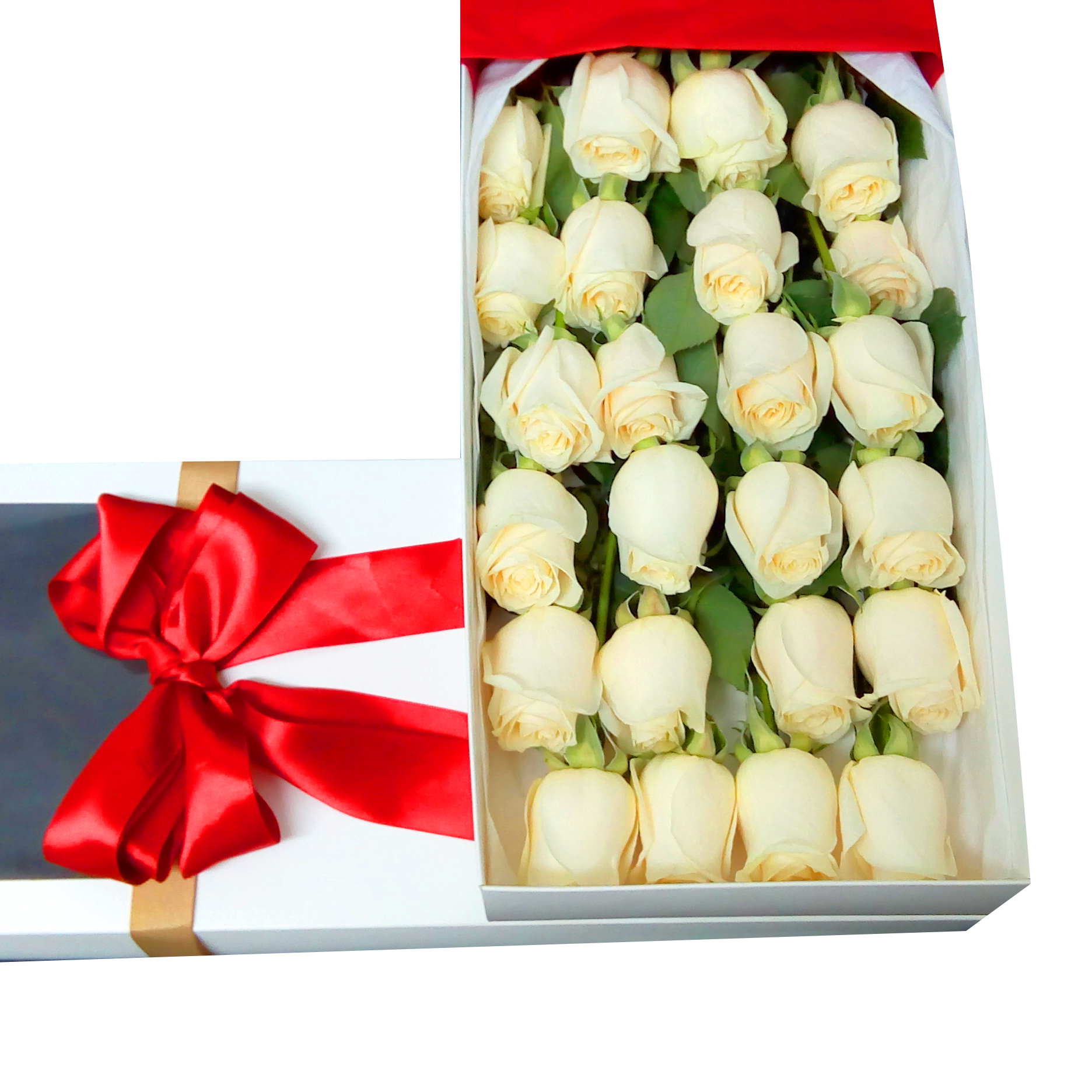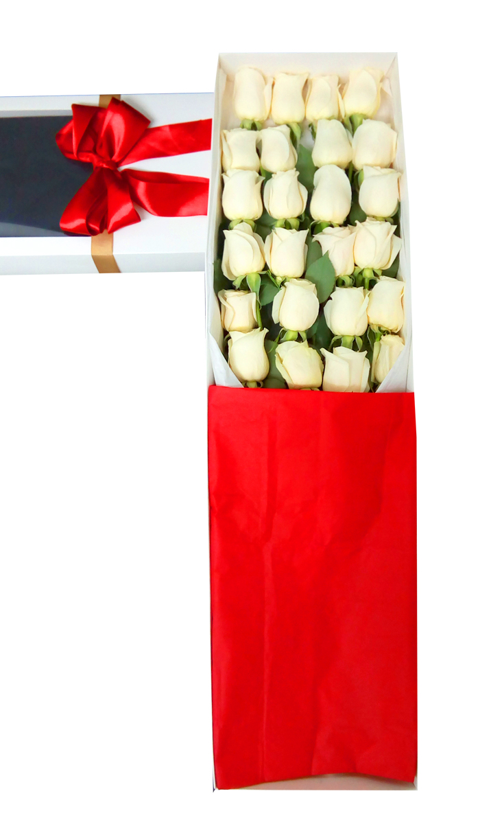 - Sorpréndela con esta espectacular caja de 24 bellas Rosas blancas Ecuatorianas con tallo largo desespinadas. Cada Rosa va insertada en una bombilla con agua (Aquapick) para su hidratación y mantención durante el traslado, van envueltas en un fino y sedoso papel mantequilla blanco, con un sachet de preservante floral para su durabilidad, un instructivo para el cuidado de las flores y un refinado sobre con una tarjeta para mensajes. La caja que abarca las Rosas son de elegantes terminaciones de cartón color blanco, sujetada con una hermosa cinta santín.