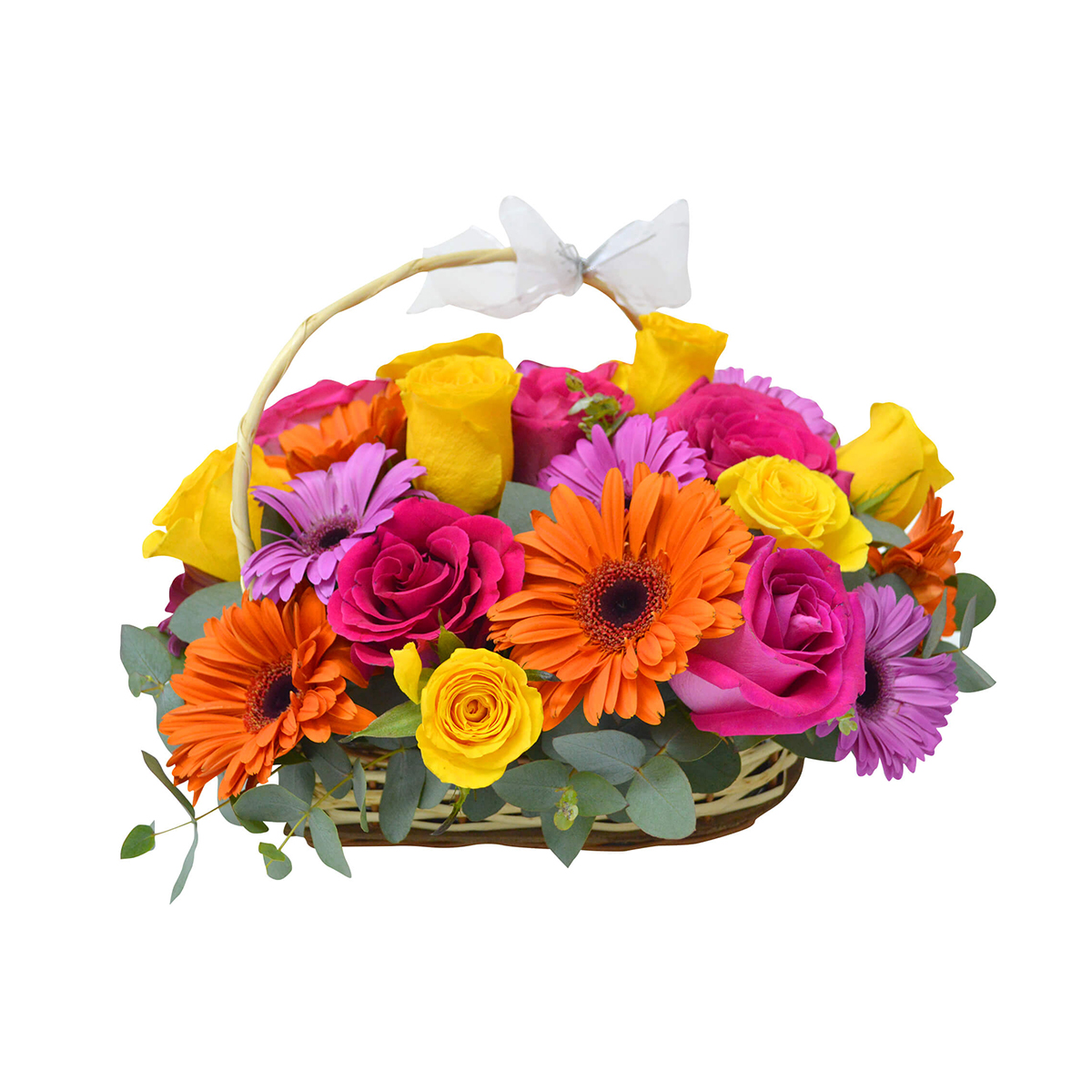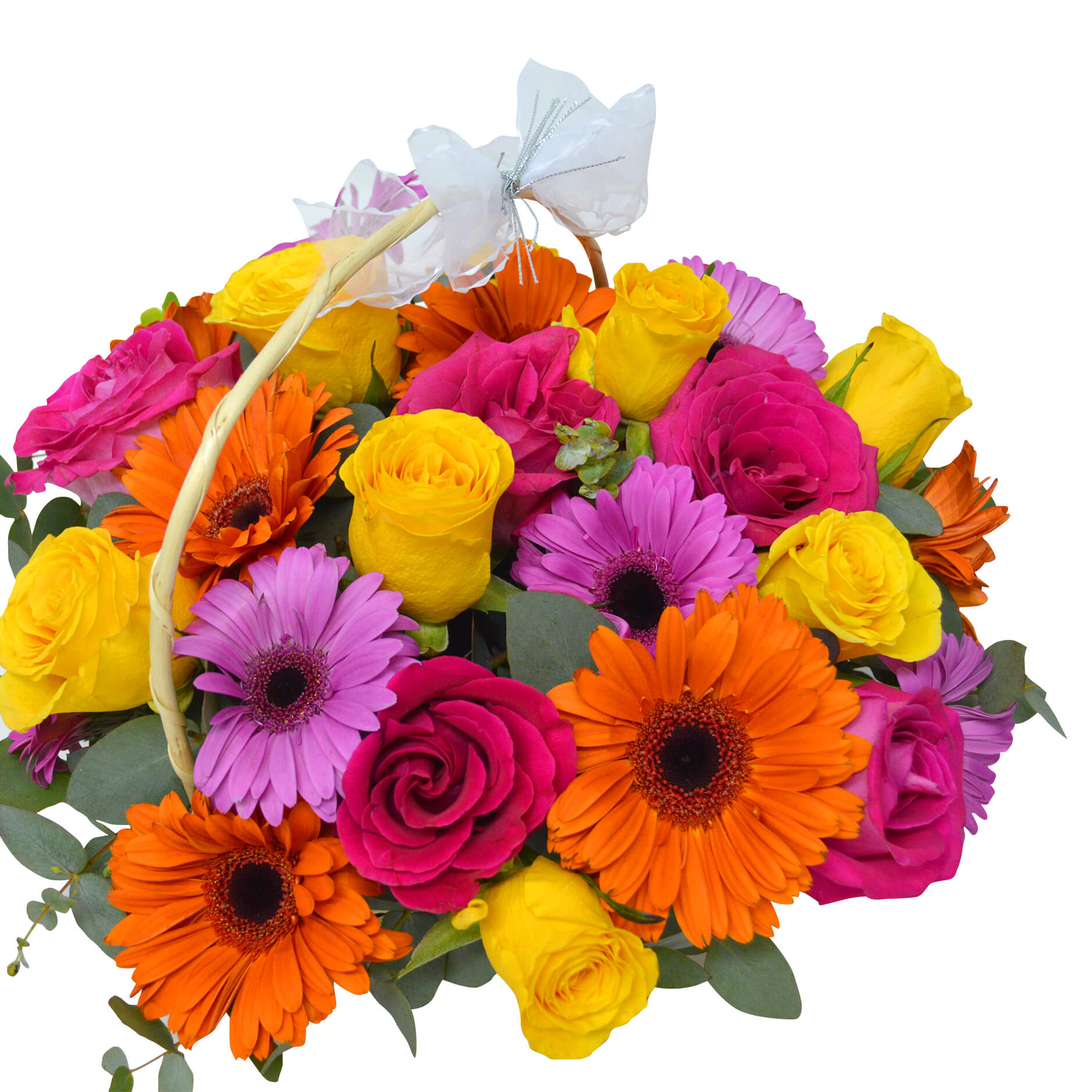 - Fantástico canasto para regalar en un momento especial, con un mix colores de: 5 tropicales Gerberas naranjo, 5 Gerberas fucsia de Exportación, 10 Rosas Fucsias Ecuatorianas, 10 Rosas Amarillas, 3 Mini Eucaliptus. Este espectáculo de flores va sobre un canasto de mimbre, adornado con una colorida cinta organza, instructivo para el cuidado de las flores y una tarjeta para enviar el mensaje que desees. No lo dudes y regala este hermoso canasto en ese momento tan inolvidable que quedara marcado para toda la vida.
