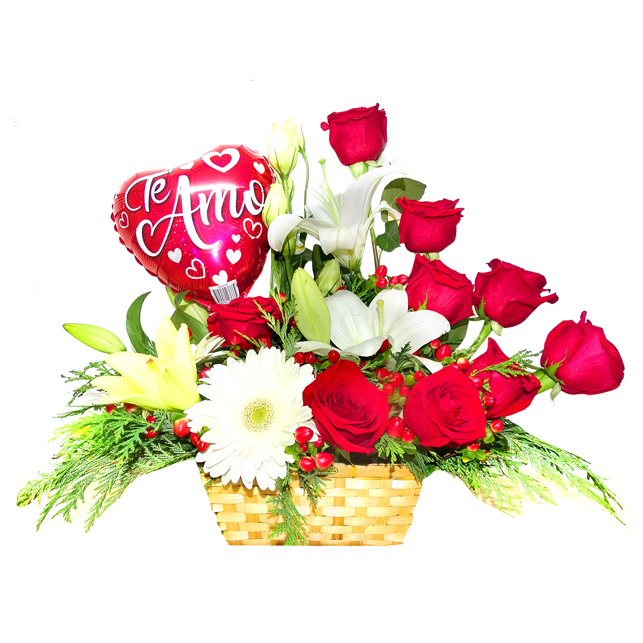 - Fantástico canasto para regalar en un momento especial, con un mix colores de: 9 Rosas Rojas, 2 Gerberas blancas, 2 Lilium blanco, 6 varas de Hypericum, 1 vara de Lisiantus, 5 varas de Tuya.. Este espectáculo de flores va sobre un canasto de mimbre tejido en forma rectangular, instructivo para el cuidado de las flores y una tarjeta para enviar el mensaje que desees. No lo dudes y regala este hermoso canasto en ese momento tan inolvidable que quedara marcado para toda la vida.