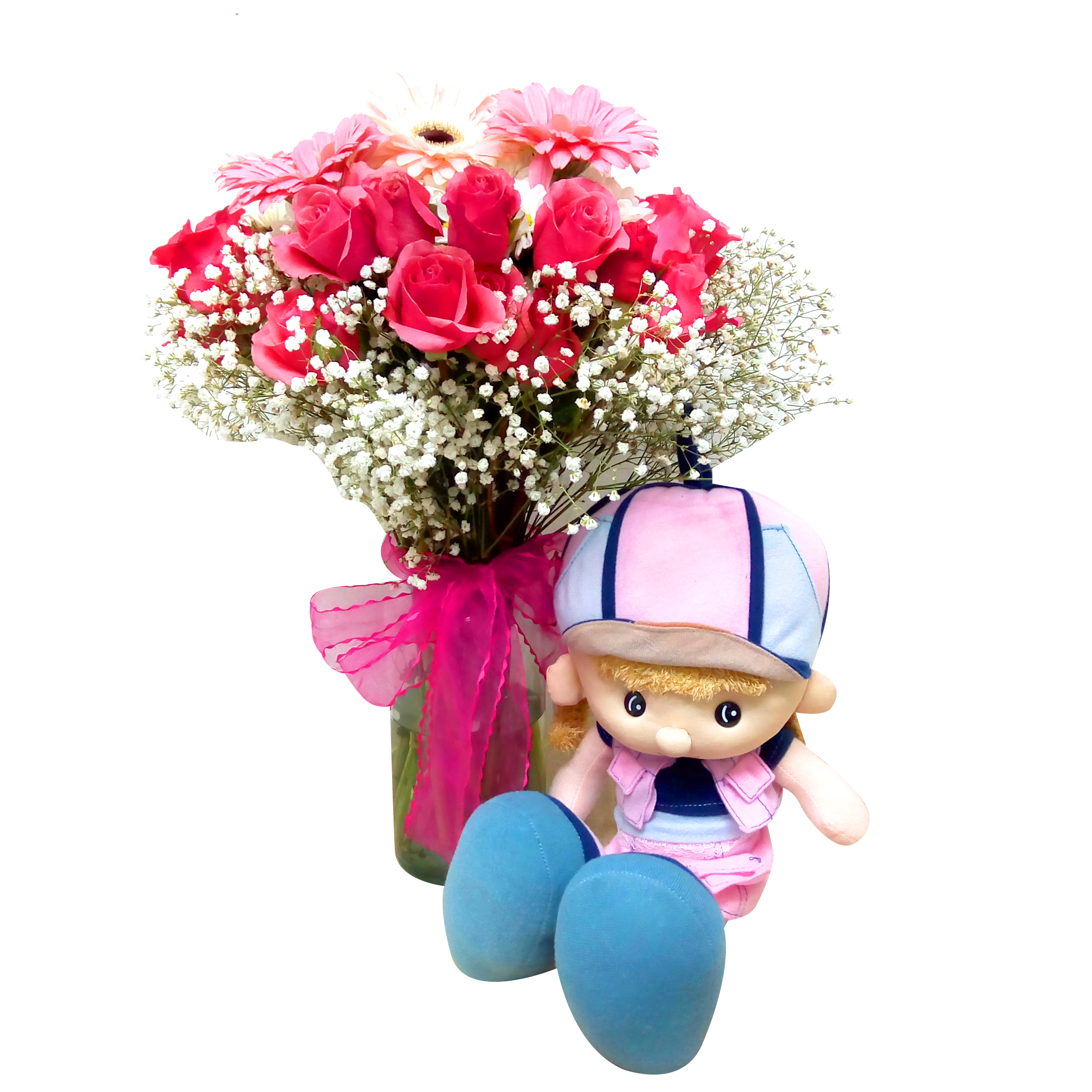 - Ideal para celebrar la llegada a la nueva princesa de la familia, tierno canasto compuesto por 10 tiernas Mini Rosas rosadas Ecuatorianas, 6 Gerberas Rosadas, 5 Mable margarita y 5 Gypsophilia. Acompañado por una lindo peluche de Niña que le terminara de dar el toque especial a la bienvenida de esta angelita. Este mix de flores va expuesto en un florero de vidrio.Incluye un instructivo para el cuidado de las flores mas una tarjeta para enviar el mensaje que desees.