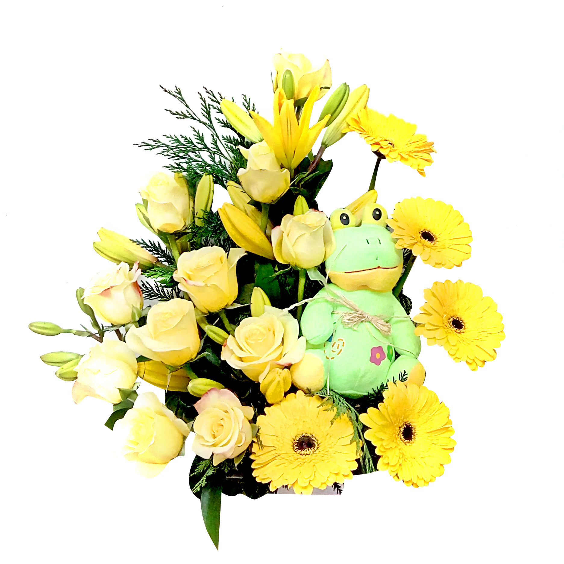 - Ideal para celebrar la llegada al nuevo Varoncito de la familia, tierno canasto compuesto por 5 Gerberas amarillas, 11 Rosas amarillas, 5 Lilium amarillo, , 10 Tuya, 5 Ruscus y como acompañamiento un hermoso peluche de Rana que le terminara de dar el toque especial a la bienvenida de este angelito. Incluye un instructivo para el cuidado de las flores mas una tarjeta para enviar el mensaje que desees.