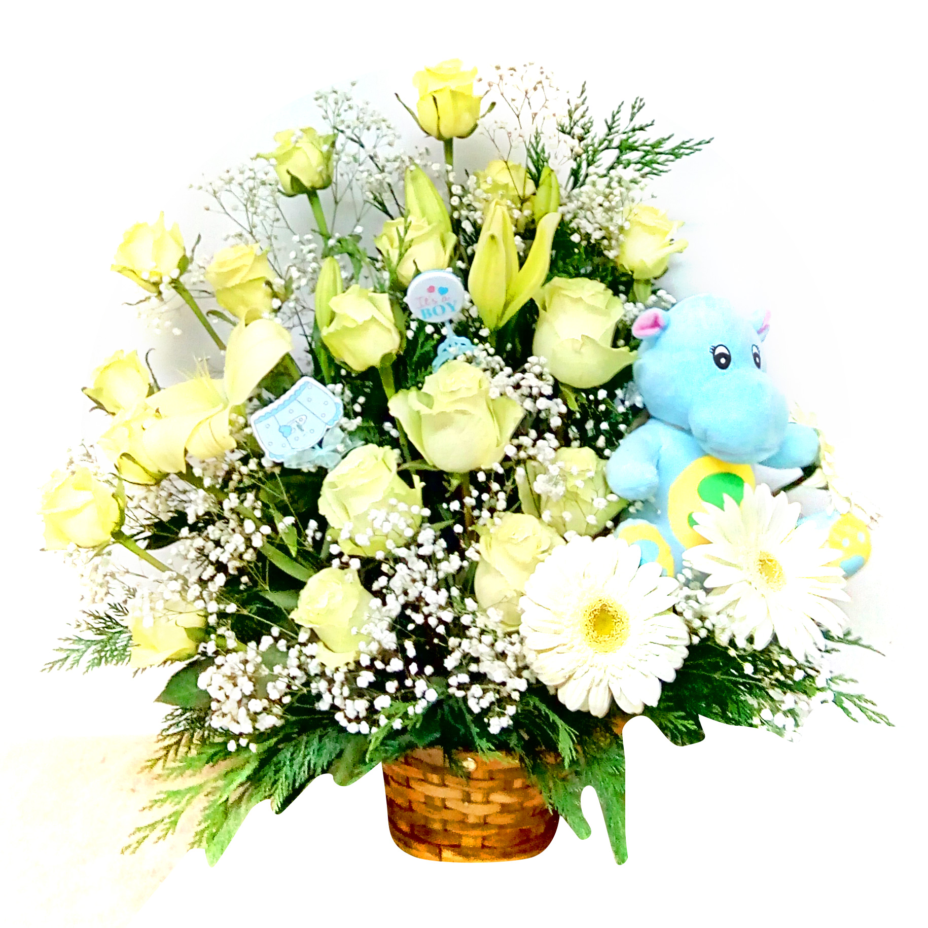 - Ideal para celebrar la llegada al nuevo Varoncito de la familia, tierno canasto compuesto por 3 Gerberas blancas, 20 Rosas blancas,1 Lilium, 3 Gypsophilia, 10 Tuya y como acompañamiento un hermoso peluche de Hipopótamo azul que le terminara de dar el toque especial a la bienvenida de este angelito. Incluye un instructivo para el cuidado de las flores mas una tarjeta para enviar el mensaje que desees.
