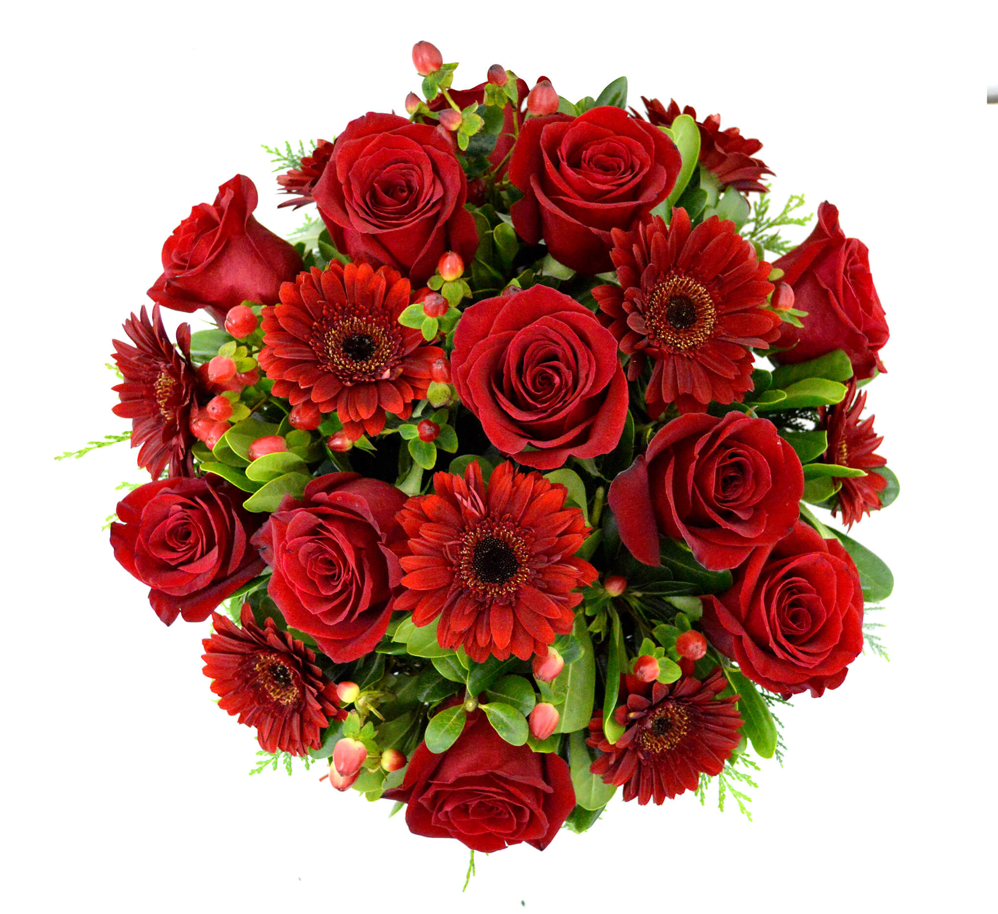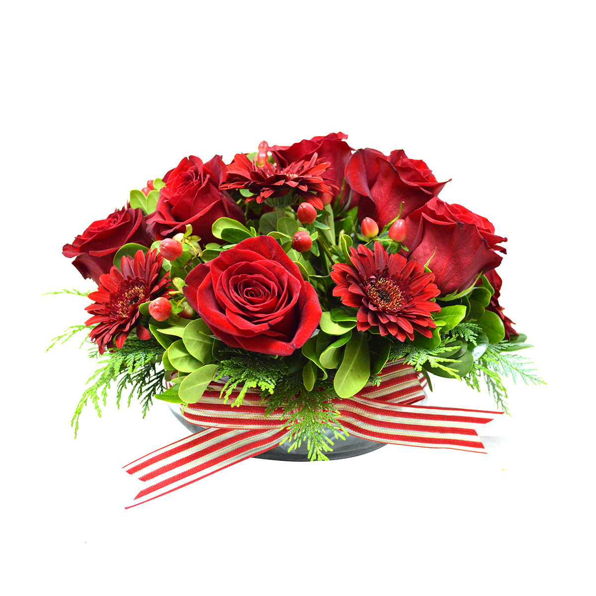 - Sorprende con este tierno centro de mesa con 10 Mini Gerbera rojas tallo largo de Exportación, 3 bellisimas Rosas rojas, 3 Hypericum rojo y de follaje Peterporum, un instructivo para el cuidado de las flores, insertado un refinado sobre con una tarjeta para mensajes. El centro que abarca las Flores son de base de vidrio en forma de pescera, sujetada con una hermosa cinta organza.