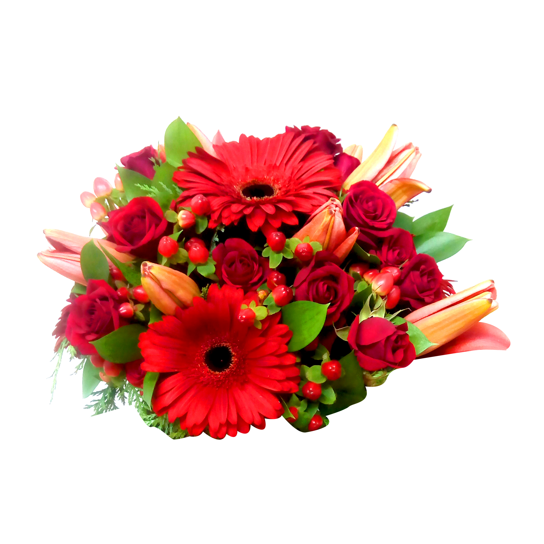 - Sorpréndela con este espectacular centro de mesa con 2 Lilium naranjo de Exportación, 4 fantásticas Mini Rosas rojas, 5 Hypericum rojos, 2 vara de Tuya, un instructivo para el cuidado de las flores, insertado un refinado sobre con una tarjeta para mensajes. El canasto que abarca las Flores son de elegantes terminaciones de plástico en forma cuadrada, sujetada con una hermosa cinta organza.