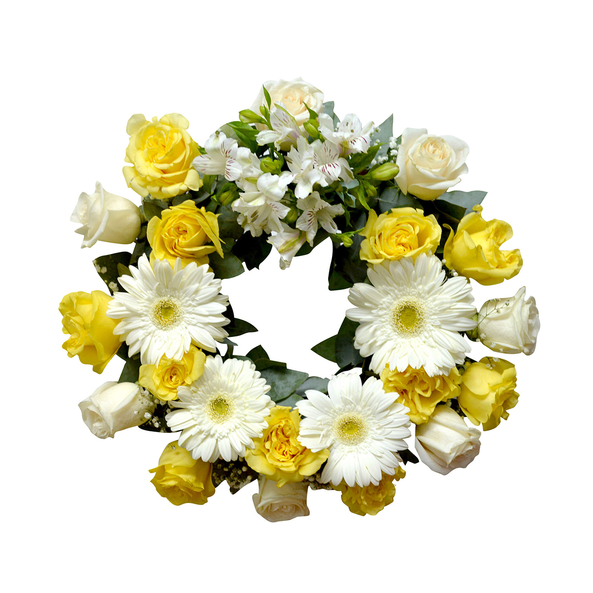 - Hermosa corona en tonos clásicos, confeccionada con 6 hermosas Rosas blancas, 12 frescas Rosas amarillas, 4 delicadas Gerberas blancas de exportación, tiernas Altromerias blancas, Gypsophilia para darle un toque de elegancia, acompañadas de un armonioso follaje de Eucaliptus. Incorpora un tarjetón donde puede escribir el mensaje que desee más un instructivo para el cuidado de las flores.