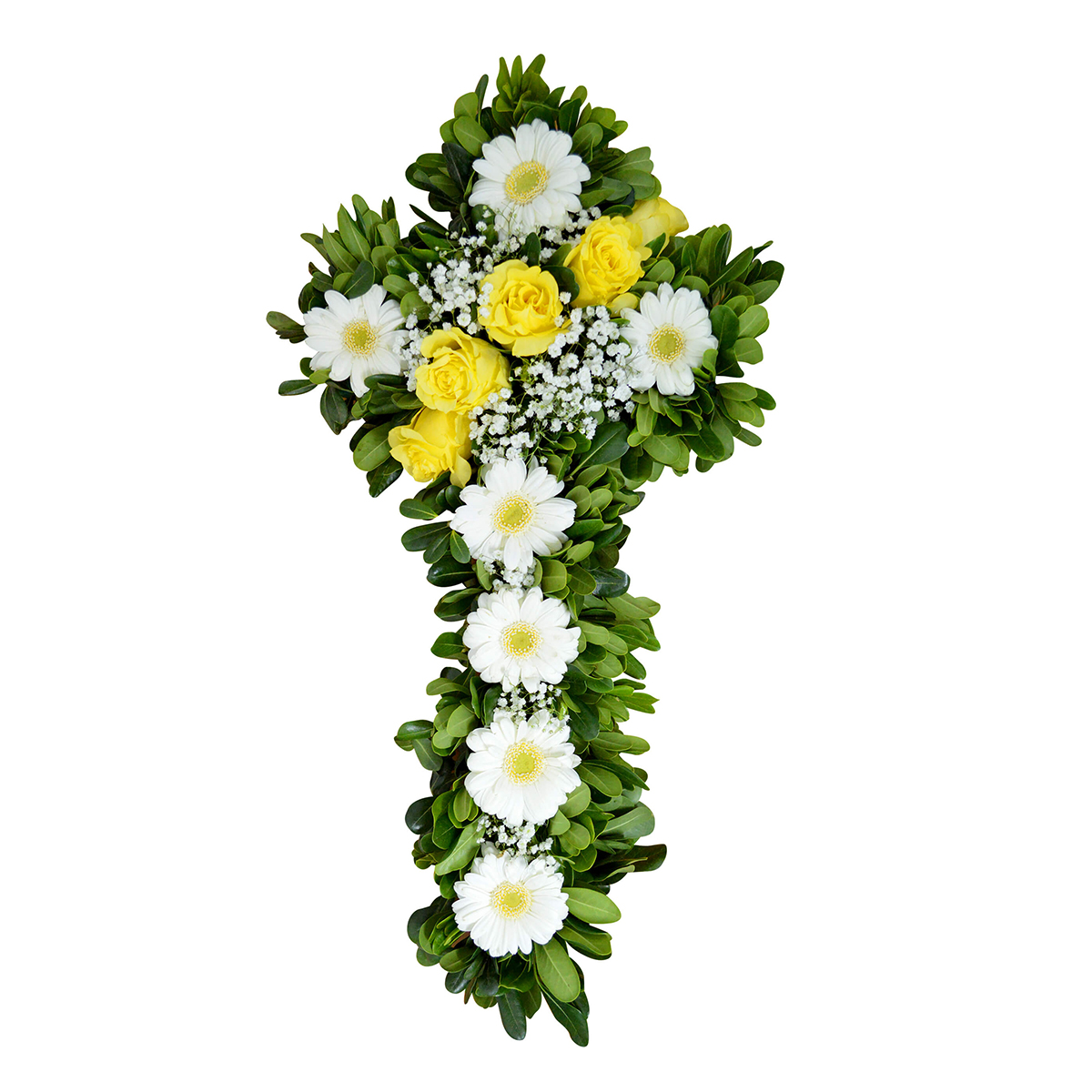 - Arreglo floral cubre urna en forma de cruz confeccionada con 6 hermosas Rosas amarillas Ecuatorianas, 4 tiernas Mini Gerberas blancas de Exportación, elegante Gypsophilia, acompañada peter porum como follaje. Es una hermosa forma de entregar su apoyo y enviar un último tributo. Incorpora un tarjetón donde puede escribir el mensaje que desee, más un instructivo del cuidado de las flores.