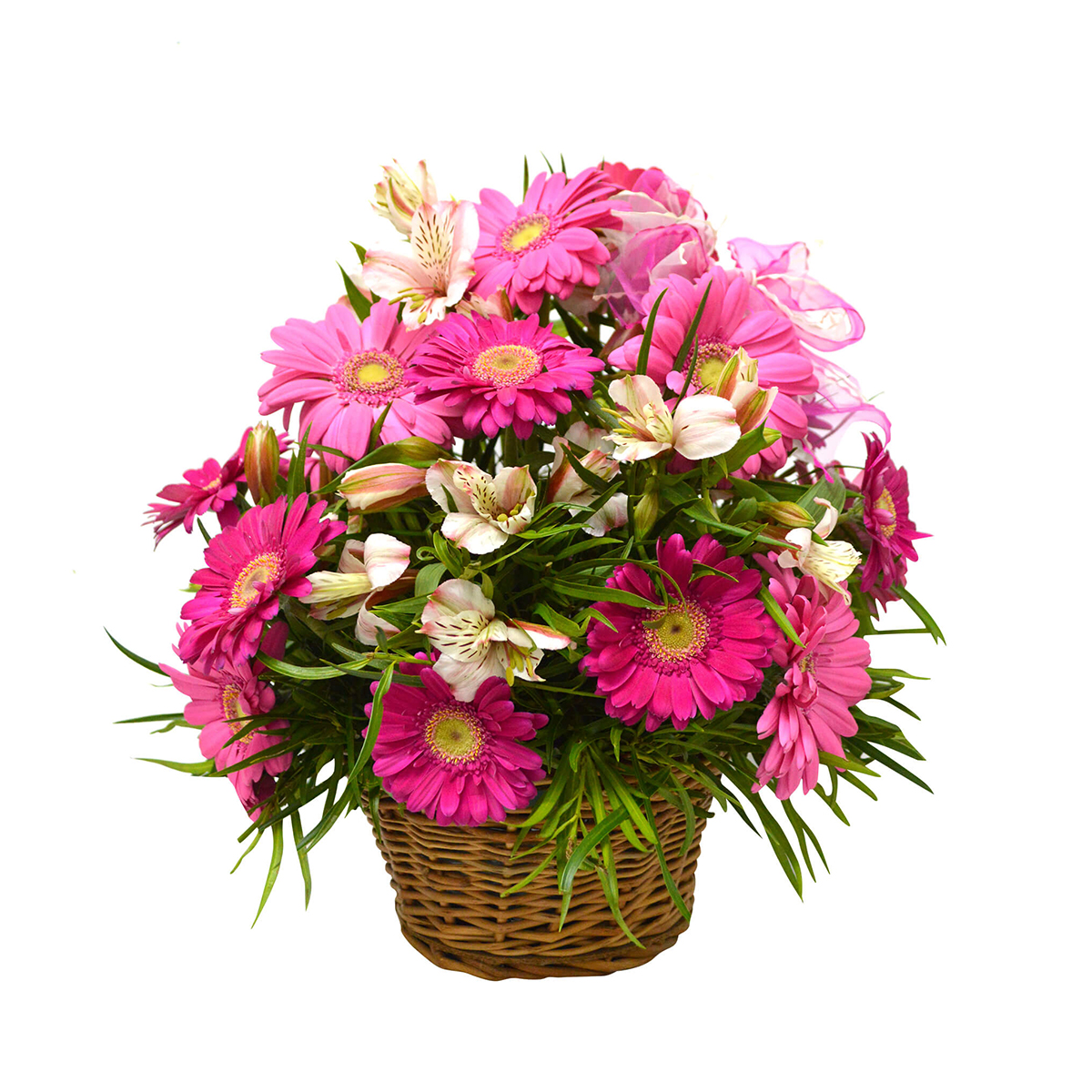 - Tierno canasto ideal para celebrar la bienvenida a la nueva princesa de la familia, con este mix colores de: 10 tiernas Mini Gerberas fucsia y 10 Alstromerias, follaje de pino chascon sobre un canasto mediano de mimbre adornado con una colorida cinta organza, instructivo para el cuidado de las flores. No lo dudes y regala este hermoso canasto para este momento tan inolvidable que quedara marcado para toda la vida.