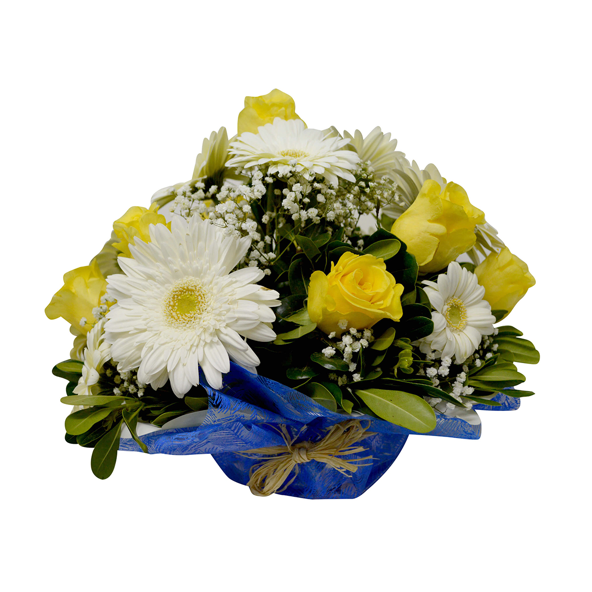 - Ideal para celebrar la llegada del nuevo Varoncito a la familia, tierno canasto compuesto por 5 Gerberas blancas tallo largo de Exportacion, 5 Mini Gerberas blancas tallo largo, 10 hermosas Rosas amarillas Ecuatorianas de tallo largo, Peterporum, Gypsophilia, en un precioso florero de vidrio en forma de pescera. Dando mucha ternura a la llegada de este angelito, agregado un instructivo para el cuidado de las flores mas una tarjeta para enviar el mensaje que desees.