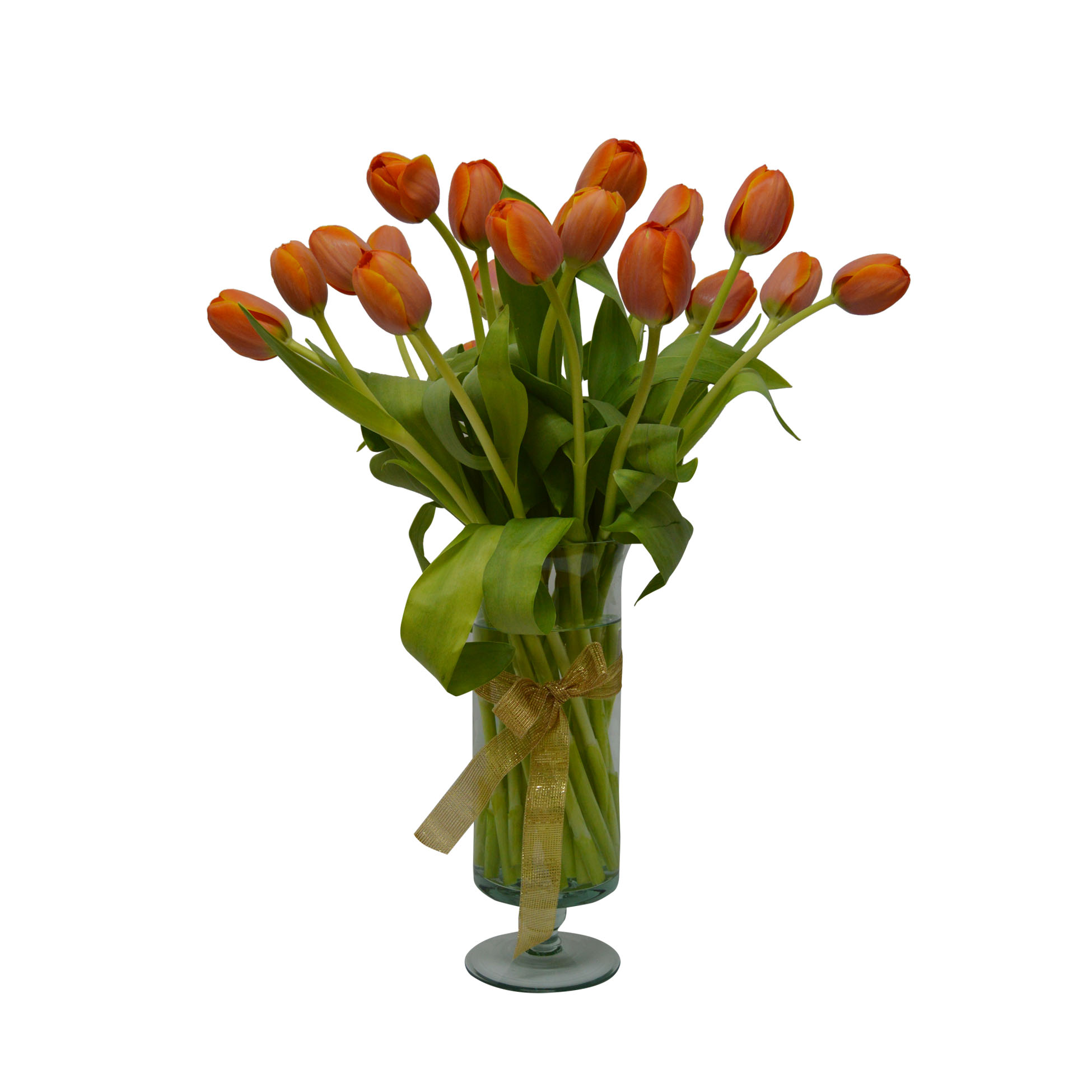 - Regale todo el color, energía y luz con estos deslumbrantes Tulipanes de Exportación. Este hermoso florero va confeccionado con 20 Tulipanes naranjo que iluminará la mirada de esa persona especial. Este precioso buquet va en un delicado florero de vidrio transparente decorado con una delicada cinta dorada. Incorpora un tarjetón donde usted puede escribir el mensaje que desee.