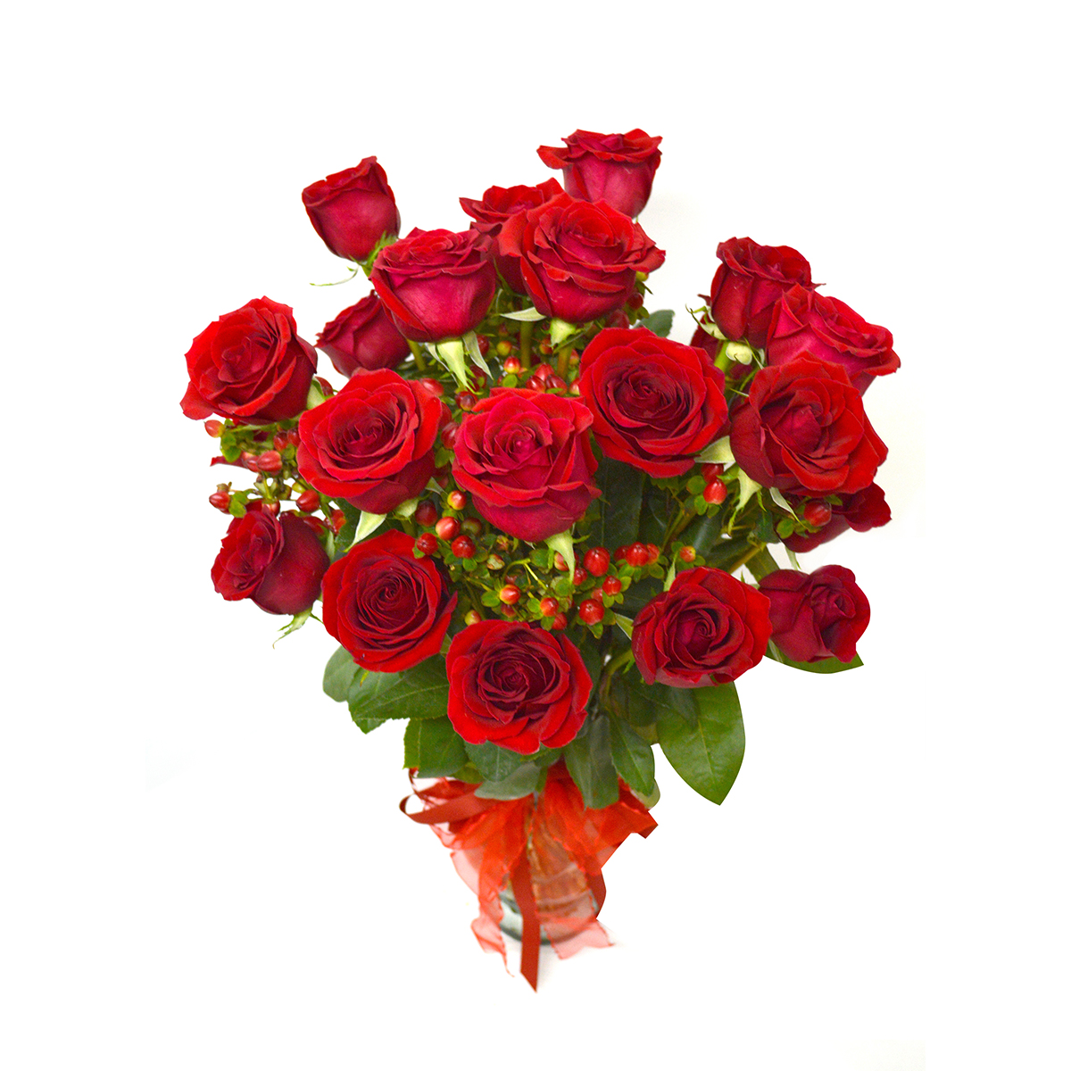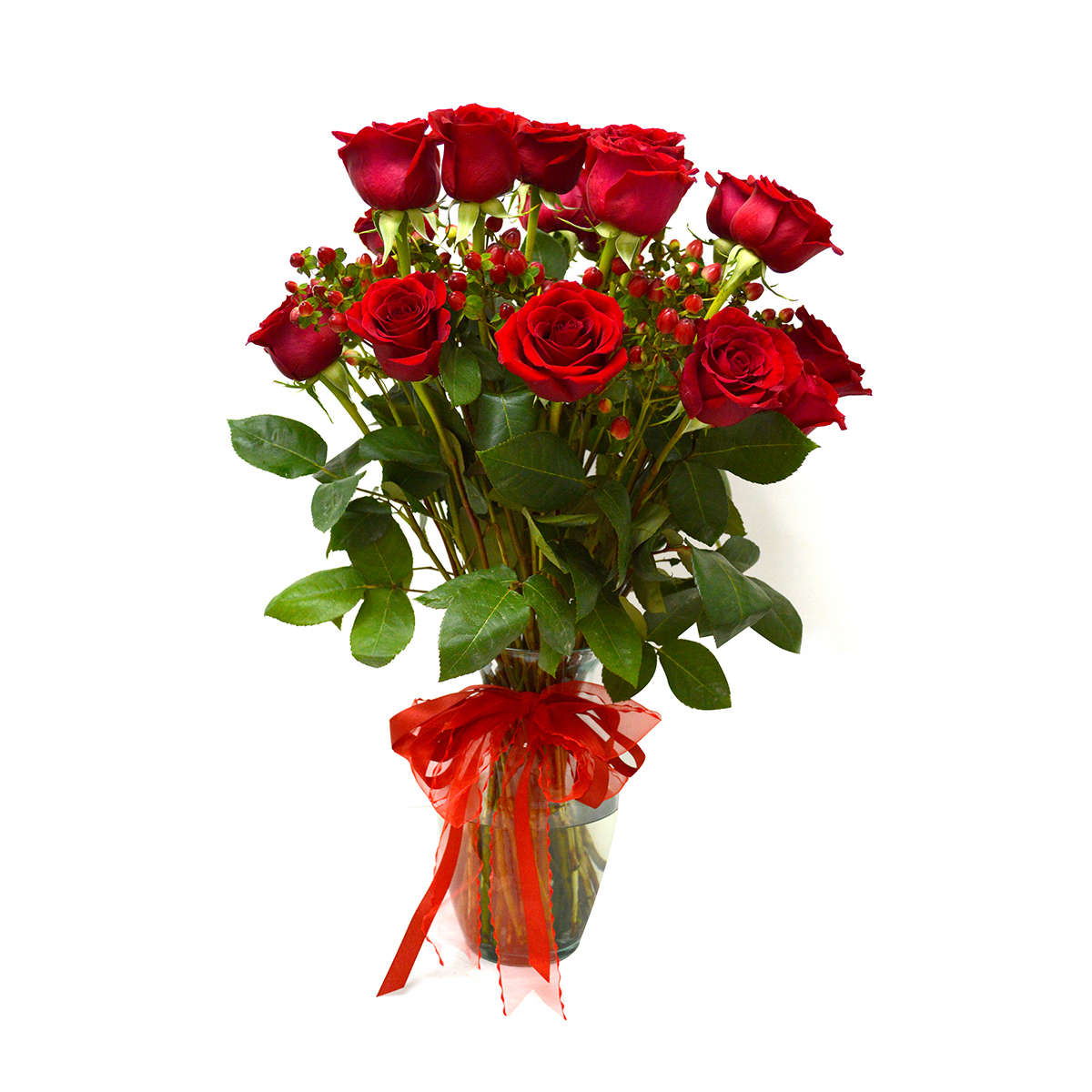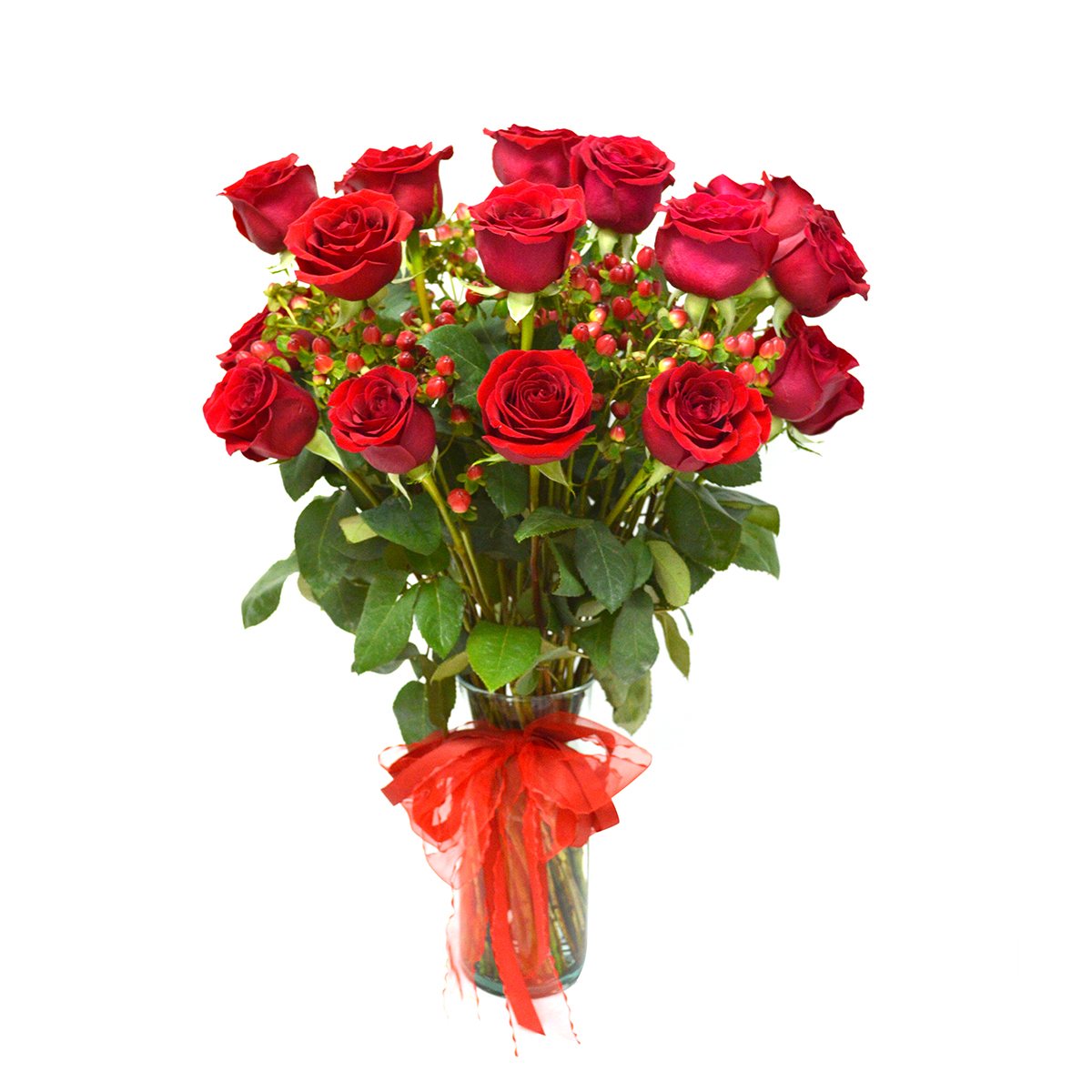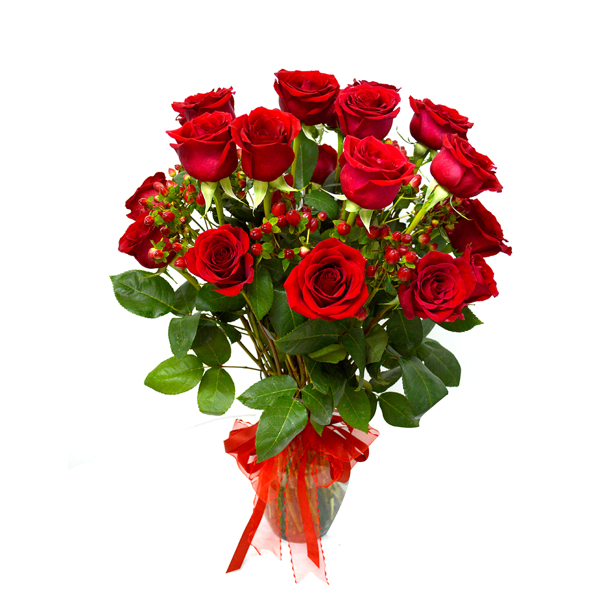 - Hazle pasar un momento inolvidable, con este apasionante Florero de 24 exquisitas Rosas rojas Ecuatorianas de colora elección, acompañada por 10 hypericum rojo. Este precioso buquet va en un delicado florero de vidrio transparente (Variedad de Jarrones) que hacen que esta imagen de armonía quede grabada en la memoria de quien la recibe, adornado con una hermosa cinta roja que realza la belleza de este destacado Jarrón.