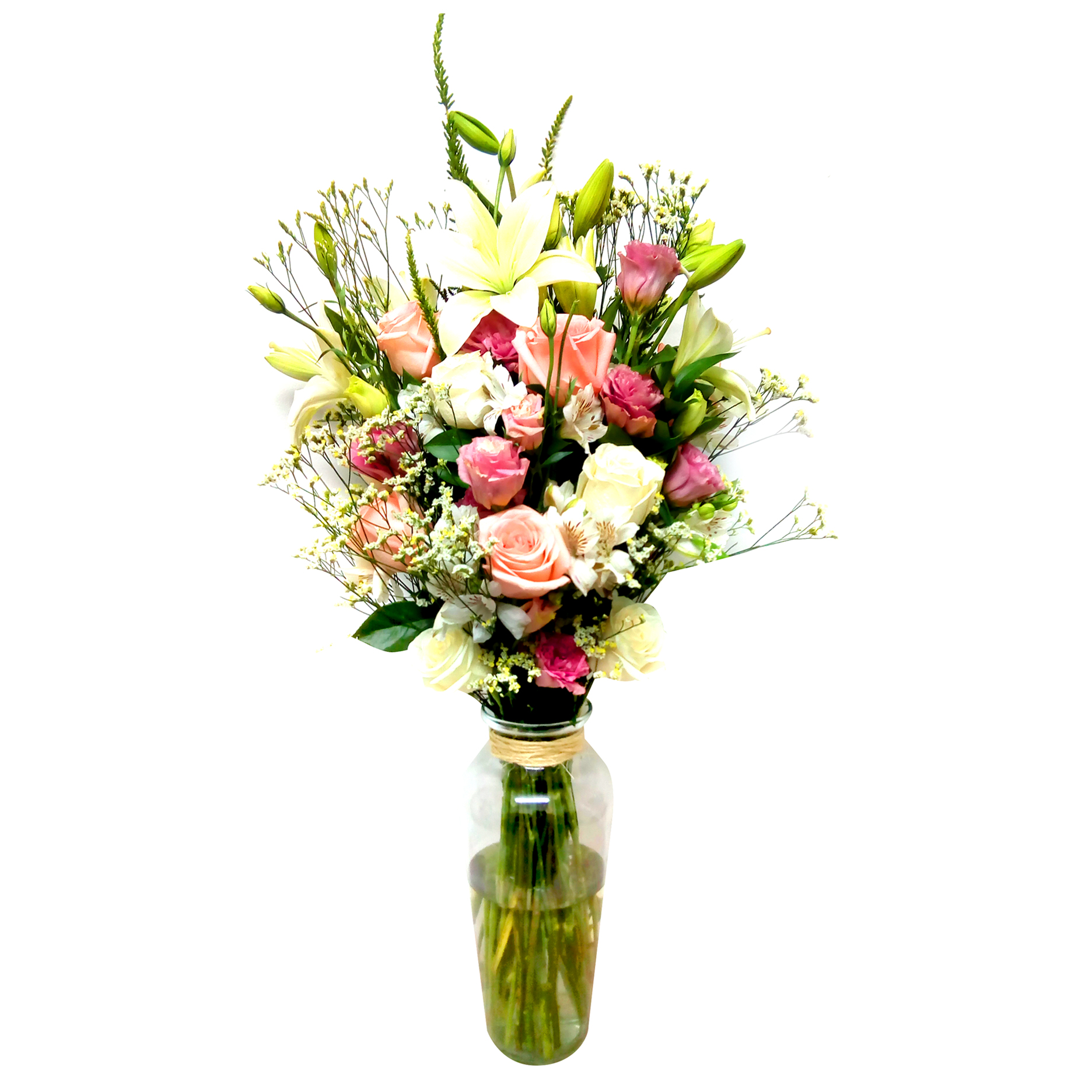 - Radiante Florero con un Mix floral de 5 hermosas Rosas blancas Ecuatorianas de tallo largo, 5 Rosas rosadas, 6 elegantes Lisianthus lila, 6 Alstromerias blanco, 4 espectaculares Lilium blanco, 2 Limunium blanco, 2 Pino Romero . Emiten un mensaje de halagadora elegancia para regalar en cualquier ocasión. Este impresionante ramo va en un delicado florero de vidrio transparente bellamente adornado con cinta morada.