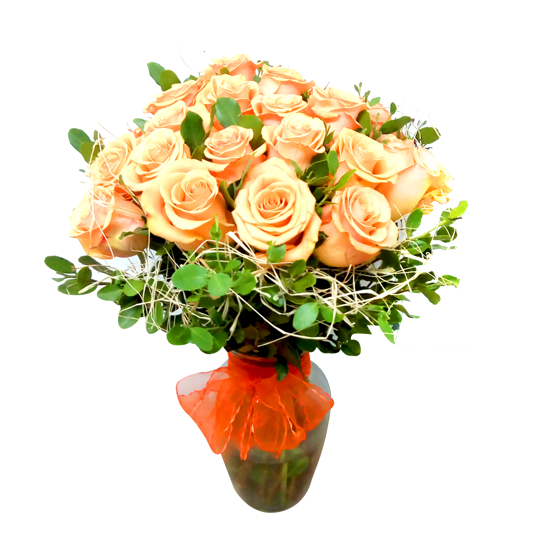 - Radiante Florero con 24 Rosas damasco tallo largo Ecuatorianas, 10 varas de Follaje verde mas rafia. Emiten un mensaje de halagadora elegancia para regalar en cualquier ocasión. Este impresionante ramo va en un delicado florero de vidrio transparente bellamente adornado con cinta roja.