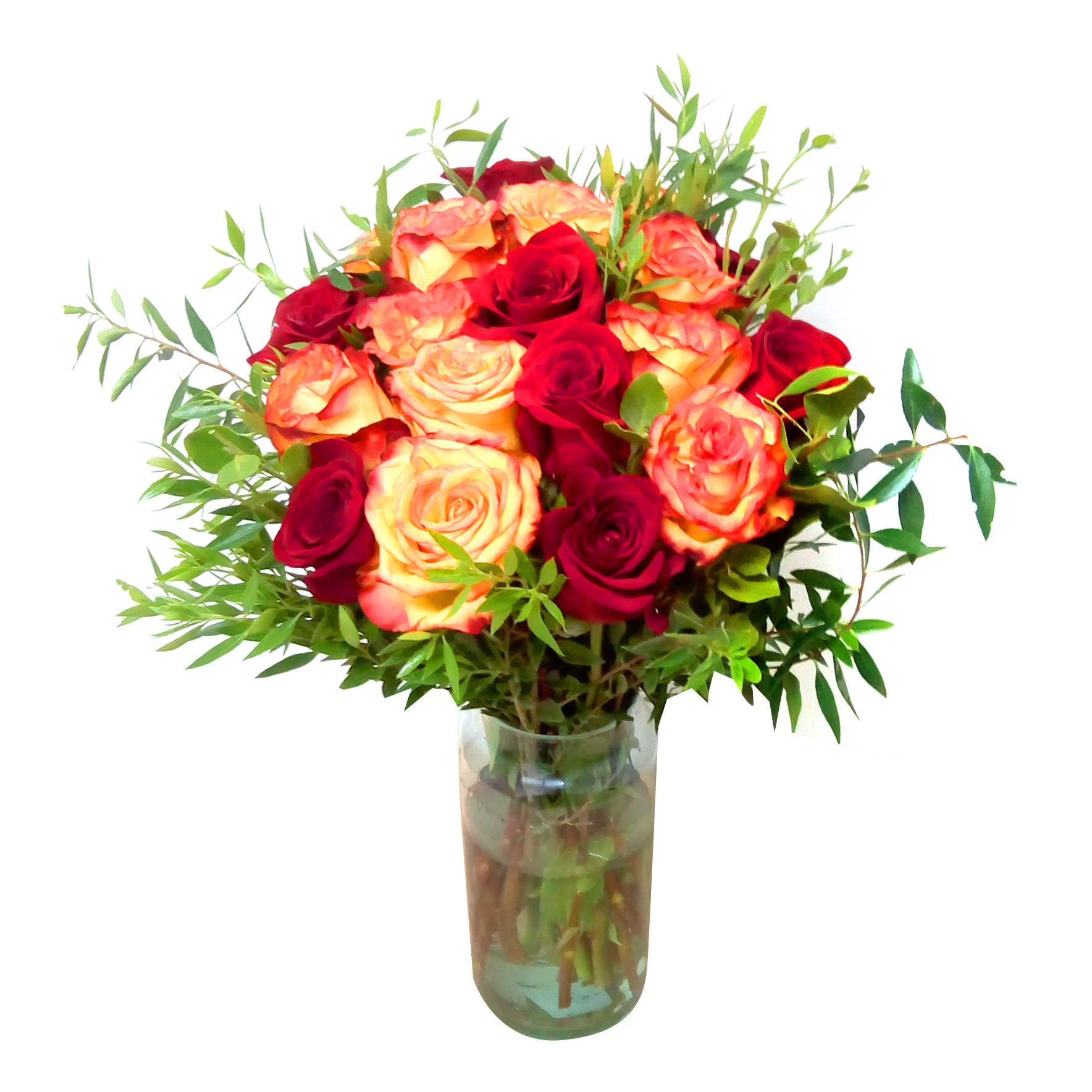 - Radiante Florero con 10 bellas Rosas rojas Ecuatorianas, 10 Rosas bicolor rojo-amarillo, follaje verde. Emiten un mensaje de halagadora elegancia para regalar en cualquier ocasión. Este impresionante ramo va en un delicado florero de vidrio transparente bellamente adornado con cinta rayada.
