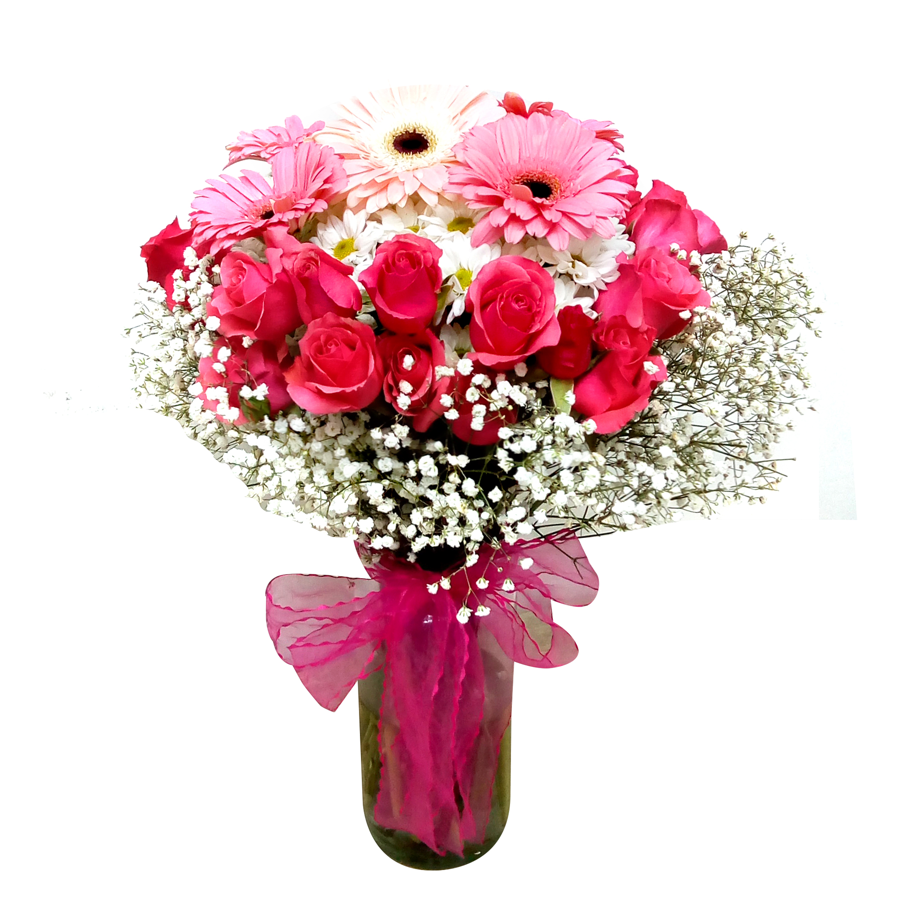 - Radiante Florero con 5 bellas Gerberas rosadas fuerte, 1 Gerbera rosado pastel, 10 Mini Rosas fucsia, 5 Mable Margarita blanco 5 Gypsophilia. Emiten un mensaje de halagadora elegancia para regalar en cualquier ocasión. Este impresionante ramo va en un delicado florero de vidrio transparente bellamente adornado con cinta morado.