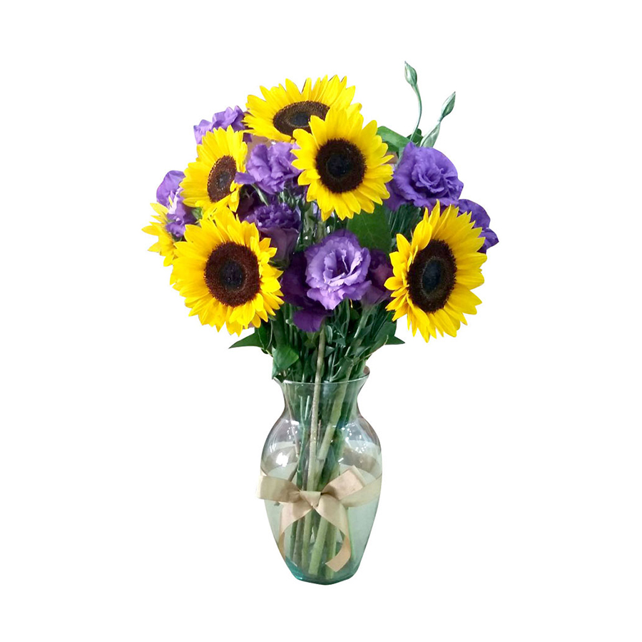 - Ilumina su mirada con este espectacular florero con este duo floral de 10 maravillosos Girasoles de tallo largo, 10 elegantes Lisianthus morados y de follaje Ruscus. Emiten un mensaje de halagadora elegancia para regalar en cualquier ocasión. Este impresionante ramo va en un delicado florero de vidrio transparente bellamente adornado con cinta decorativa de color dorado.