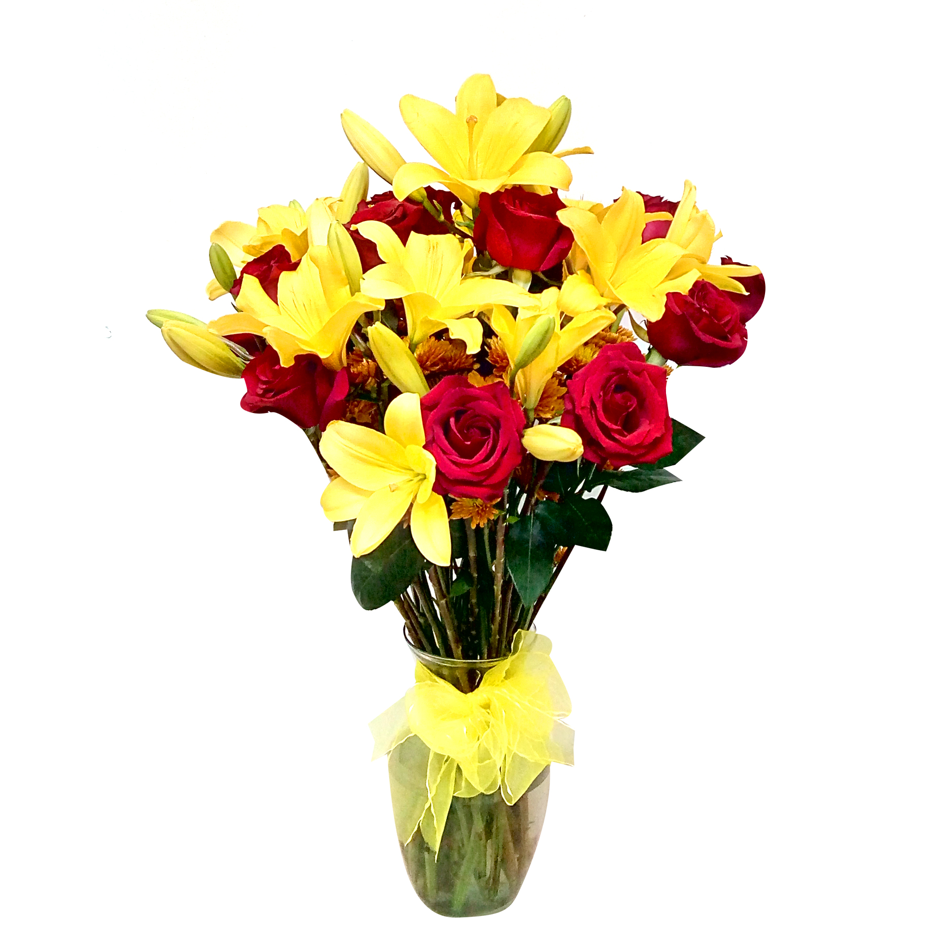 - 9Radiante Florero con un Mix floral de 15 Rosas Rojas, 3 varas de Lilium amarillo, 10 Mable Pompom naranjo. Emiten un mensaje de halagadora elegancia para regalar en cualquier ocasión. Este impresionante ramo va en un delicado florero de vidrio transparente bellamente adornado con cinta dorada.