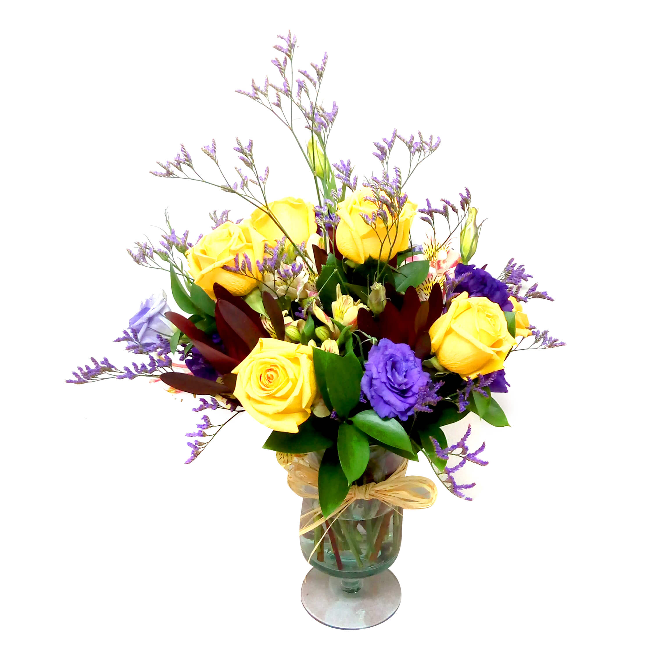 - Radiante Florero con un Mix floral de 10 hermosas Rosas amarillas, 6 Lisianthus morado, 2 Limonium, 4 elegantes Proteas, 10 duraderos Ruscus. Emiten un mensaje de halagadora elegancia para regalar en cualquier ocasión. Este impresionante ramo va en un delicado florero cuadrado de vidrio transparente bellamente adornado con cinta rafia.