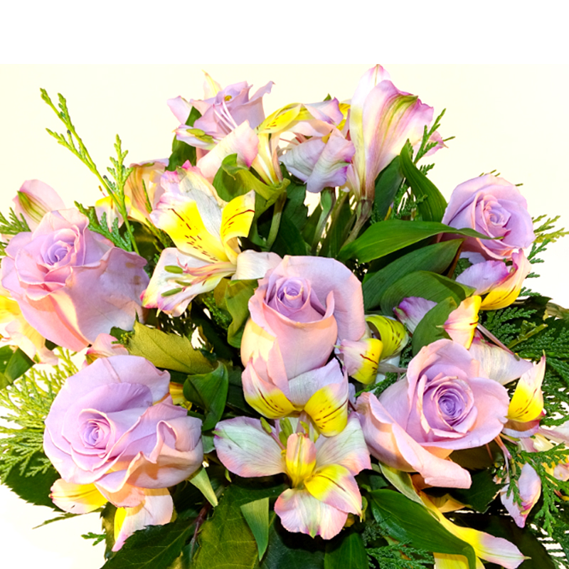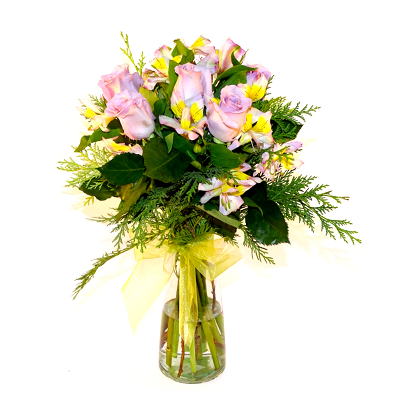 - Radiante Florero con un Mix floral de 7 tiernas Rosas moradas Ecuatorianas de tallo largo, 5 hermosas Alstromerias en tono lila con follaje Tuya. Emiten un mensaje de halagadora elegancia para regalar en cualquier ocasión. Este impresionante ramo va en un delicado florero de vidrio transparente bellamente adornado con cinta dorada.