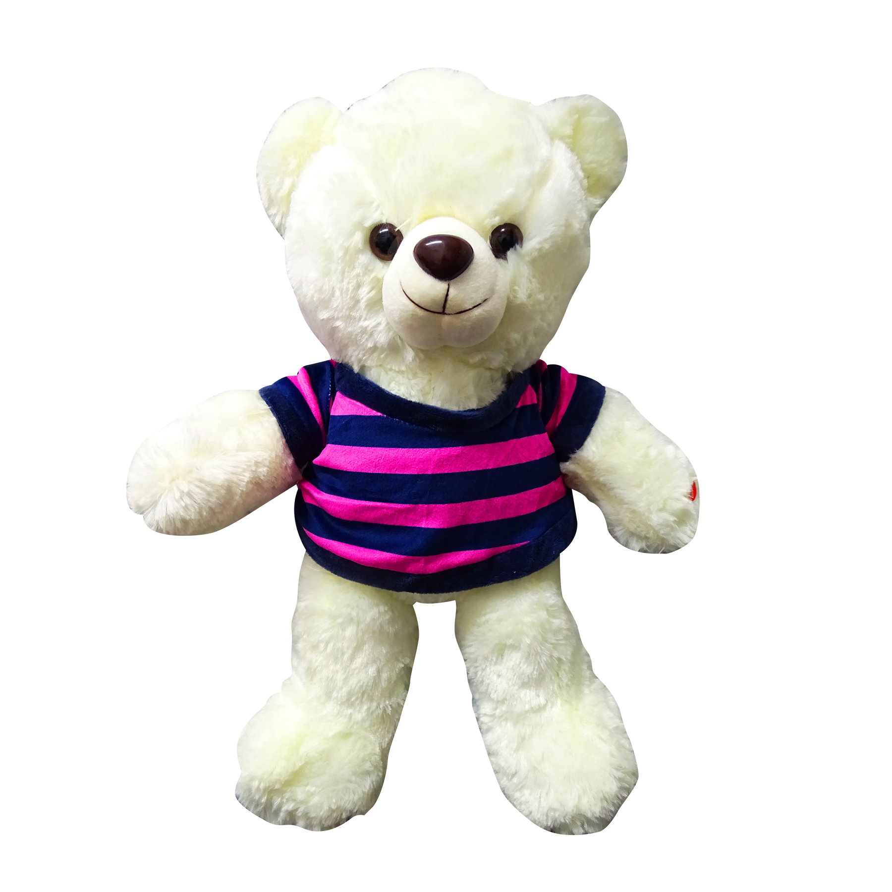 - Dulce Oso de Peluche muy blandito y suave, en tono blanco con una tierna polera de rayas azul con fucsia, sorprende y declara tu amor con esta tierna muestra de amor por esa persona especial. Ella nunca olvidará este gran detalle, mide aproximadamente 70 cm largo y 20 cm ancho.