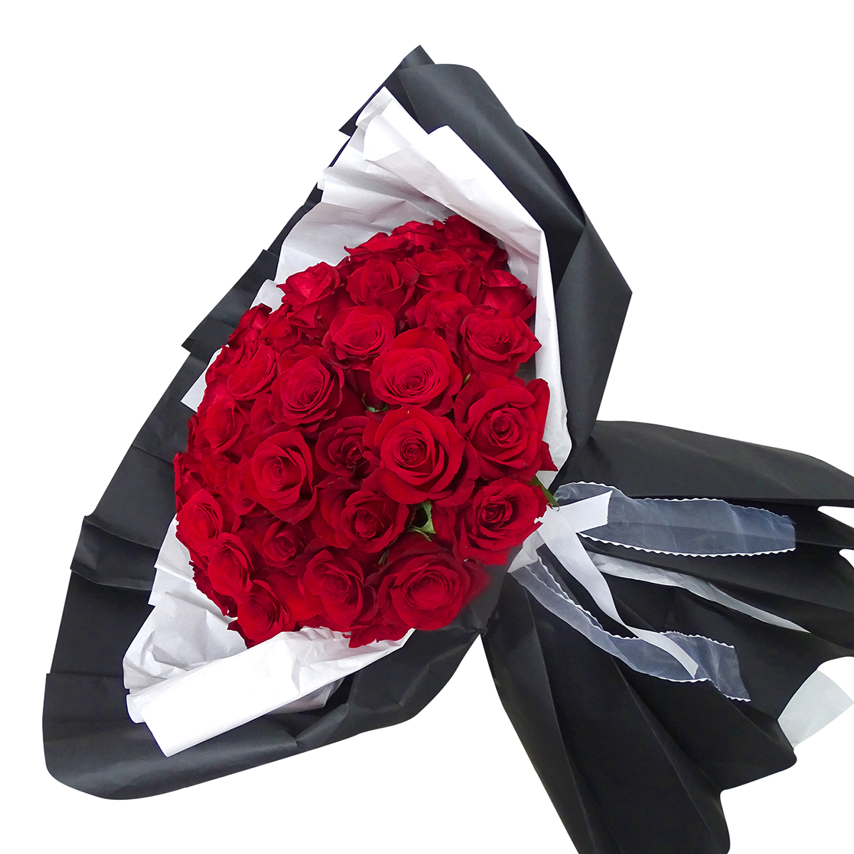 - Impactala con este intenso y frondoso ramo circular compuesto por una multitud de 100 bellas Rosas rojas Ecuatorianas de tallo largo desespinadas, van envueltas en un delicado papel mantequilla blanco, cubiertas por un papel Kraft negro para hacer de la combinación perfecta, sujetada con una hermosa cinta satín blanco, adjunto un instructivo de como cuidar las flores y un sobre con tarjeta para mensaje.