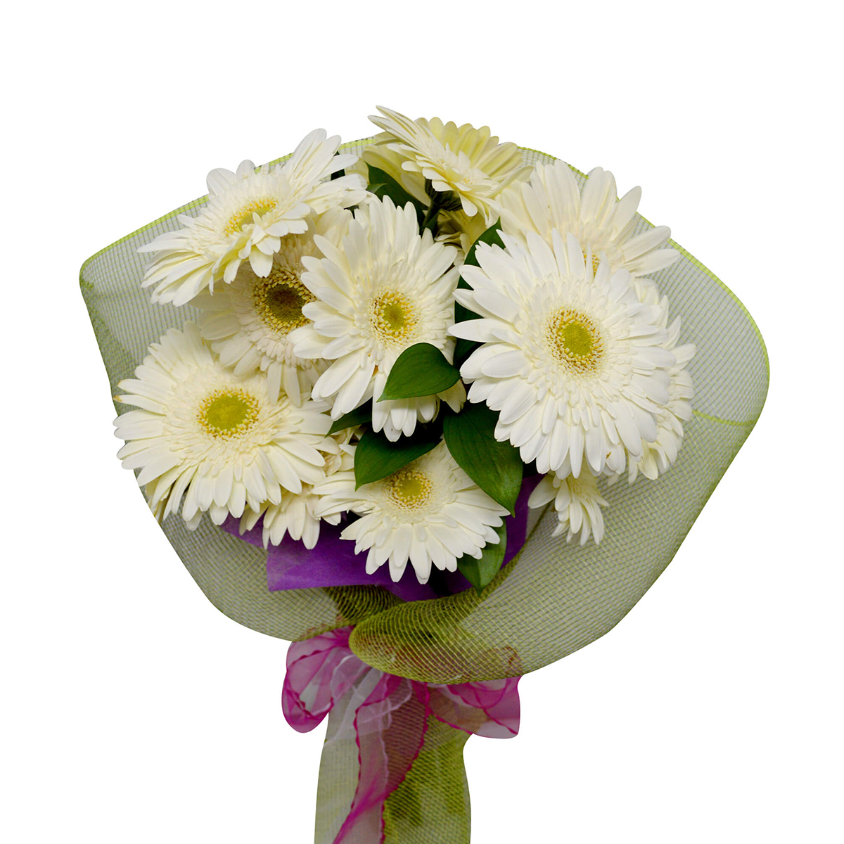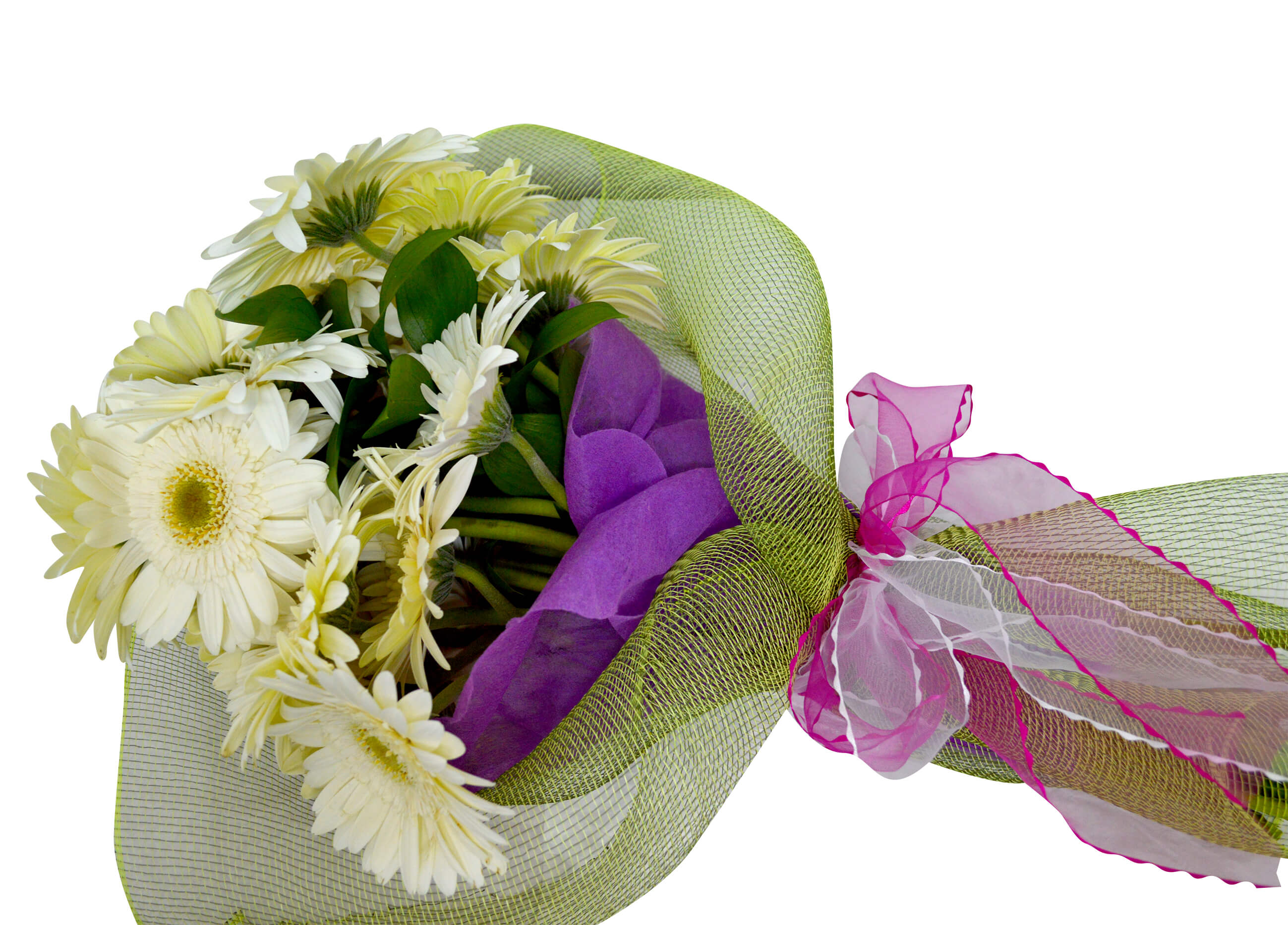 - Deleite sus sentidos con este hermoso ramo. Confeccionado con 20 Gerberas blanco con tallo largo de Exportación y 5 duraderos Ruscus, van envueltas en un fino papel arroz color morado, cubierto con una delicada malla en tono verde que va sujeta con una colorida cinta color fucsia, un instructivo de como cuidar las flores y un sobre con tarjeta para mensajes.