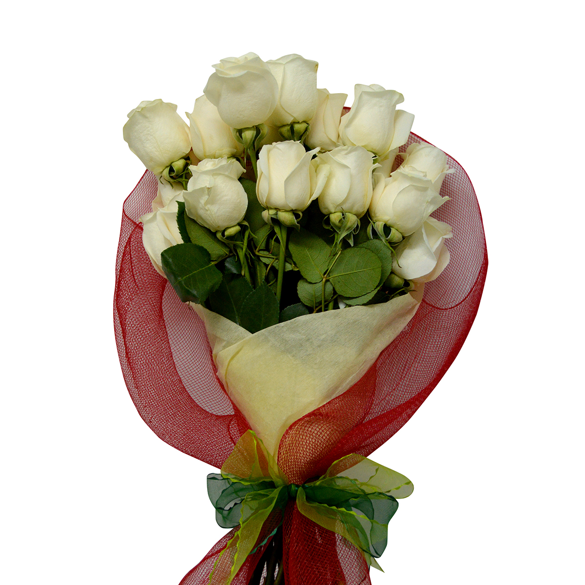 - Fascinante ramo para esa persona ideal. Está confeccionado con 24 hermosas Rosas blancas Ecuatorianas tallo largo desespinadas, van envueltas en un delicado papel arroz crema, cubiertas por una elegante malla roja, amarrado con una linda cinta blanca – roja que contrasta perfectamente con las rosas, adjunto instructivo de como cuidar las flores y un sobre con tarjeta para mensaje.