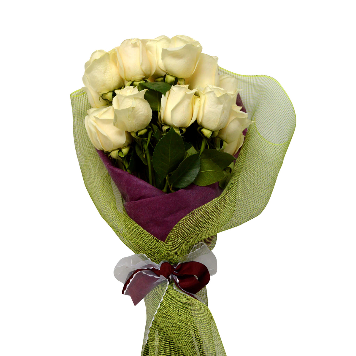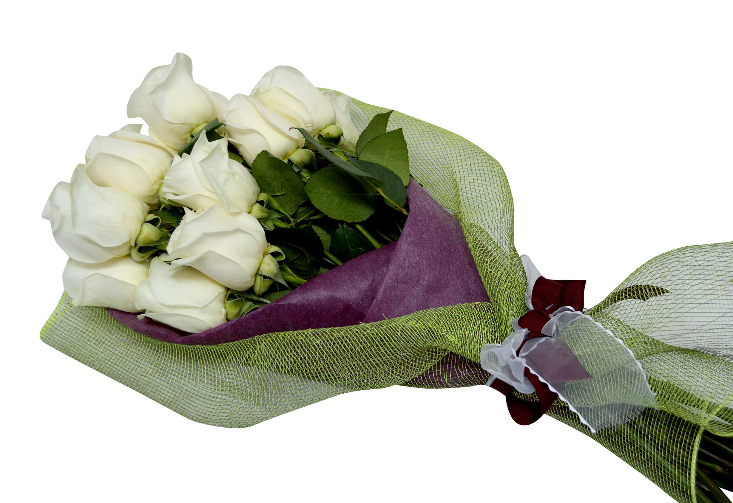 - Fascinante ramo para esa persona ideal. Está confeccionado con 24 hermosas Rosas blancas Ecuatorianas tallo largo desespinadas, van envueltas en un delicado papel arroz morado, cubiertas por una elegante malla verde, amarrado con una linda cinta burdeo que contrasta perfectamente con las rosas, adjunto instructivo de como cuidar las flores y un sobre con tarjeta para mensaje.