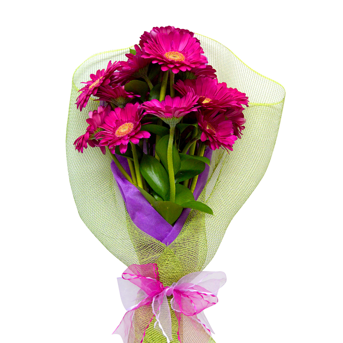 Deleite sus sentidos con este hermoso ramo. Confeccionado con 30 Mini Gerberas fucsia con tallo largo de Exportación 5 duraderos Ruscus, van envueltas en un fino papel arroz color morado, cubierto con una delicada malla en tono verde que va sujeta con una colorida cinta color fucsia, un instructivo de como cuidar las flores y un sobre con tarjeta para mensajes.