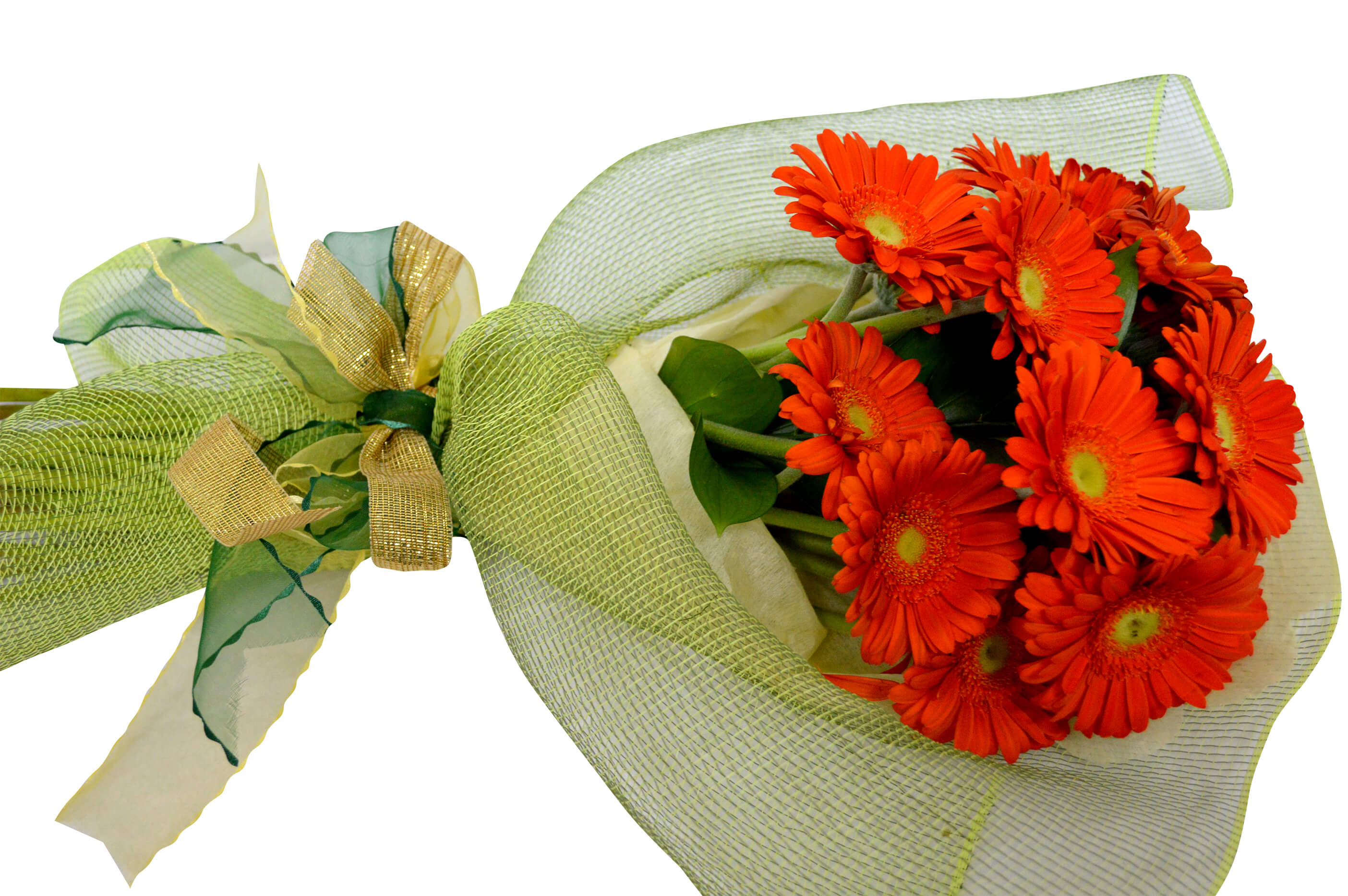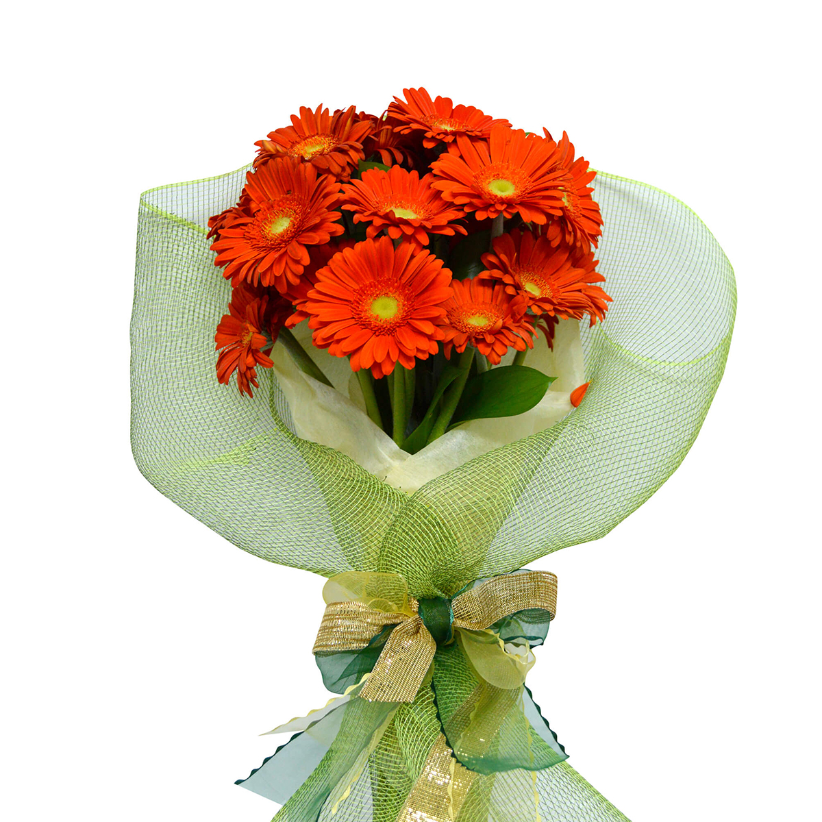 - Deleite sus sentidos con este hermoso ramo. Confeccionado con 20 Mini Gerberas naranjo con tallo largo de Exportación y 5 duraderos Ruscus, van envueltas en un fino papel arroz color crema, cubierto con una delicada malla en tono verde que va sujeta con una colorida cinta color dorado, un instructivo de como cuidar las flores y un sobre con tarjeta para mensajes.