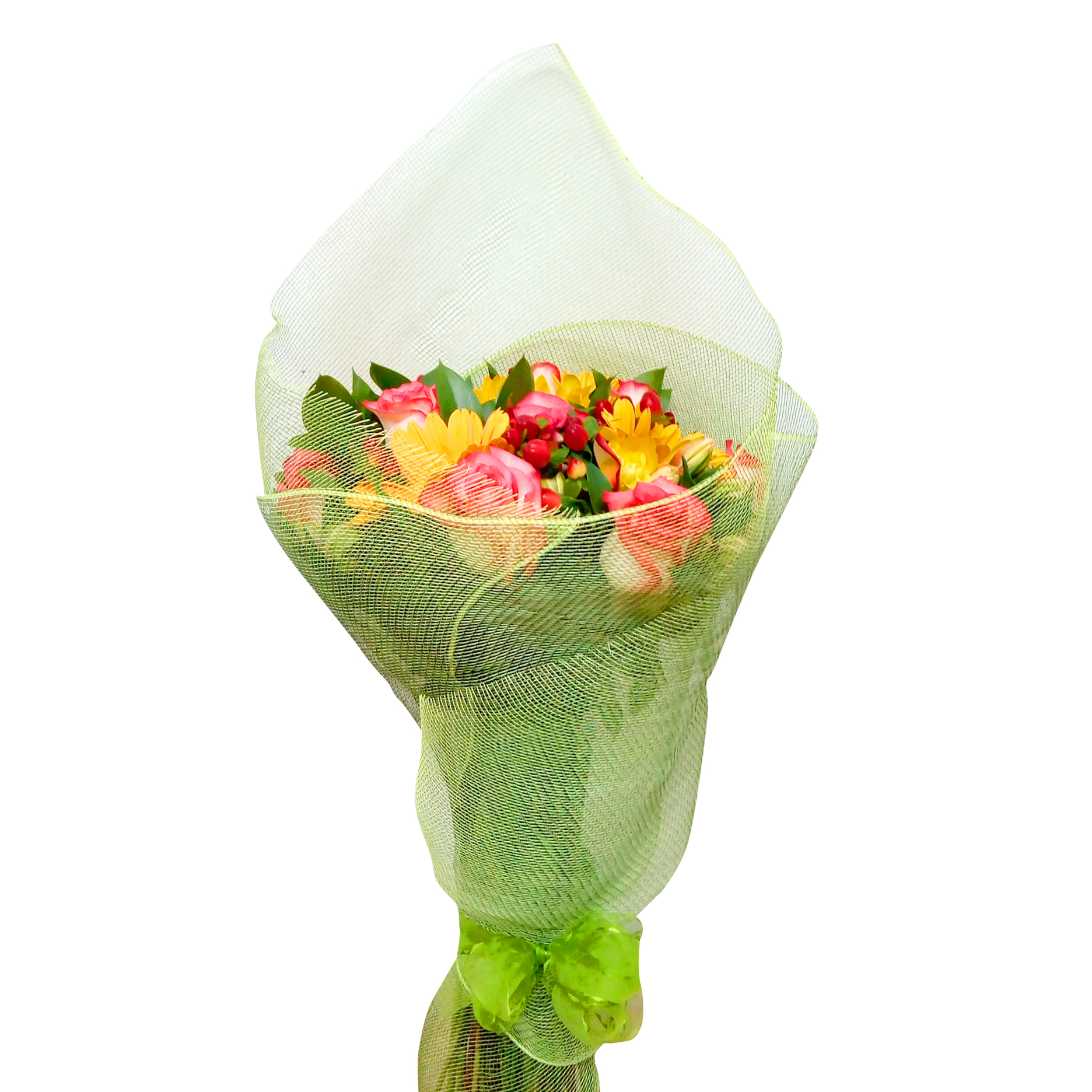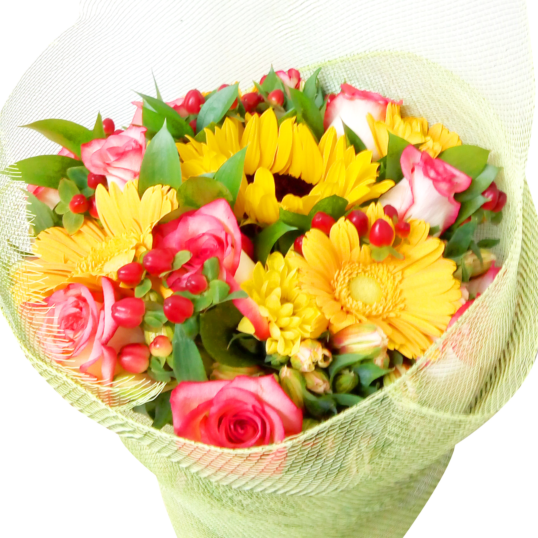 - Espectacular ramo de vivos e intensos colores. Está confeccionado con 10 bellas Rosas rosadas, 4 Gerberas amarillas, 1 Girasol, 10 Margaritas amarillas, 10 Hypericum, 10 Alstromerias rosadas, 10 duraderos Ruscus. Van envueltas en un delicado papel celofán , sujetado por una elegante cinta organza naranja, un instructivo de como cuidar las flores y un sobre con tarjeta para mensaje.