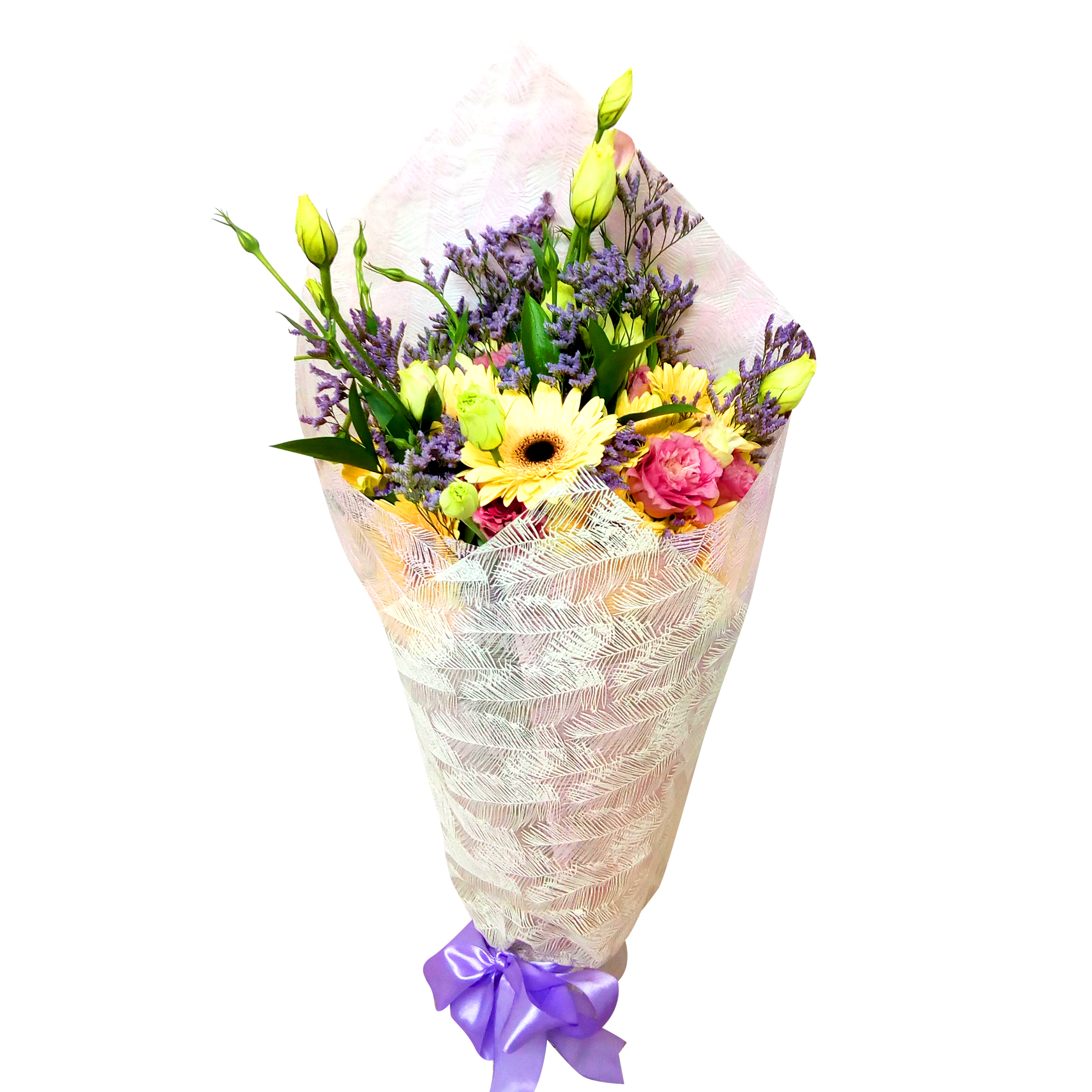 - Espectacular ramo de vivos e intensos colores. Está confeccionado con 20 Gerberas beige tallo largo de Exportación, 10 preciosos Lisianthus lila, 10 Ruscus, 5 Limonium morado, van envueltas en un delicado papel celofán blanco, sujetado por una elegante cinta satín morada, un instructivo de como cuidar las flores y un sobre con tarjeta para mensaje.