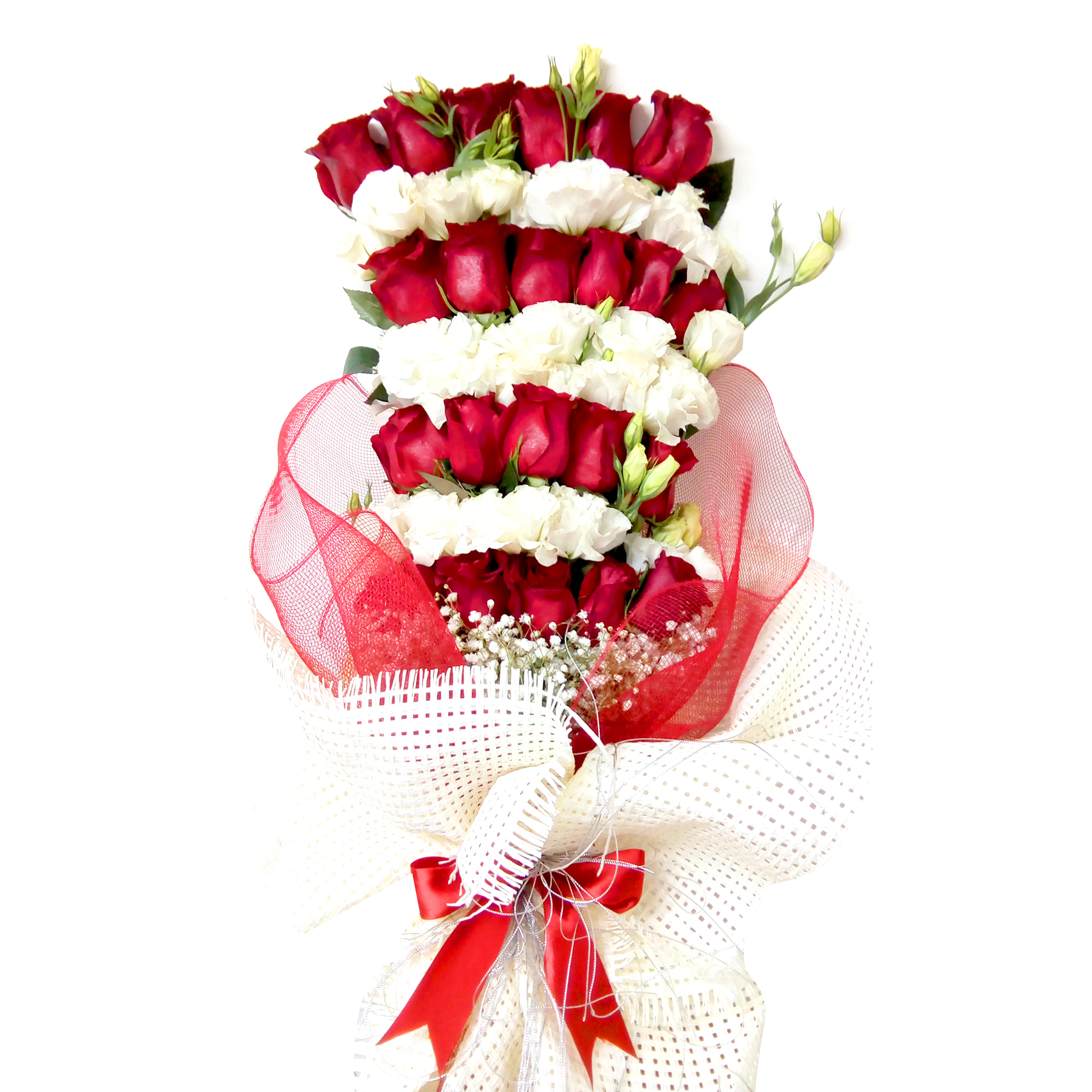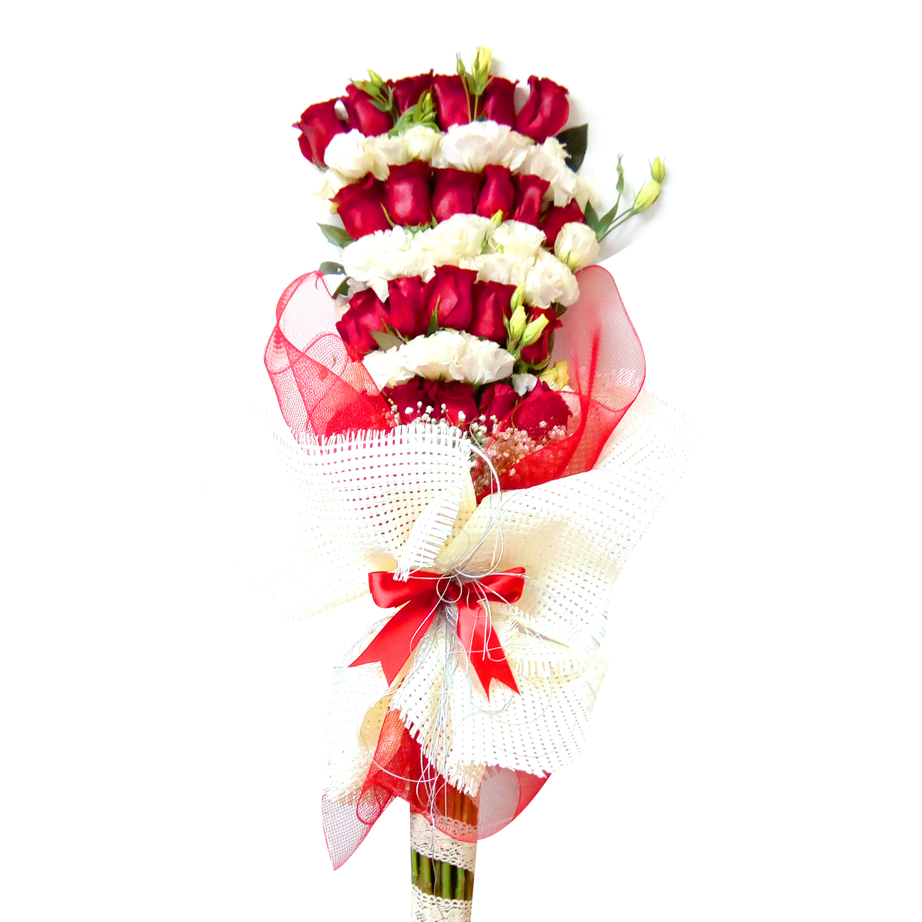- Deslumbrante ramo de vivos e intensos colores. Está confeccionado con 22 espectaculares Rosas rojas tallo largo Ecuatorianas, 15 varas de Lisianthus blanco, 2 Gypsophilia, van envueltas en delicadas Mayas Aspillera blanca y roja, sujetado por una elegante cinta satín rojo y aunado una cinta de encaje para sujetar los tallos, un instructivo de como cuidar las flores y un sobre con tarjeta para mensaje.