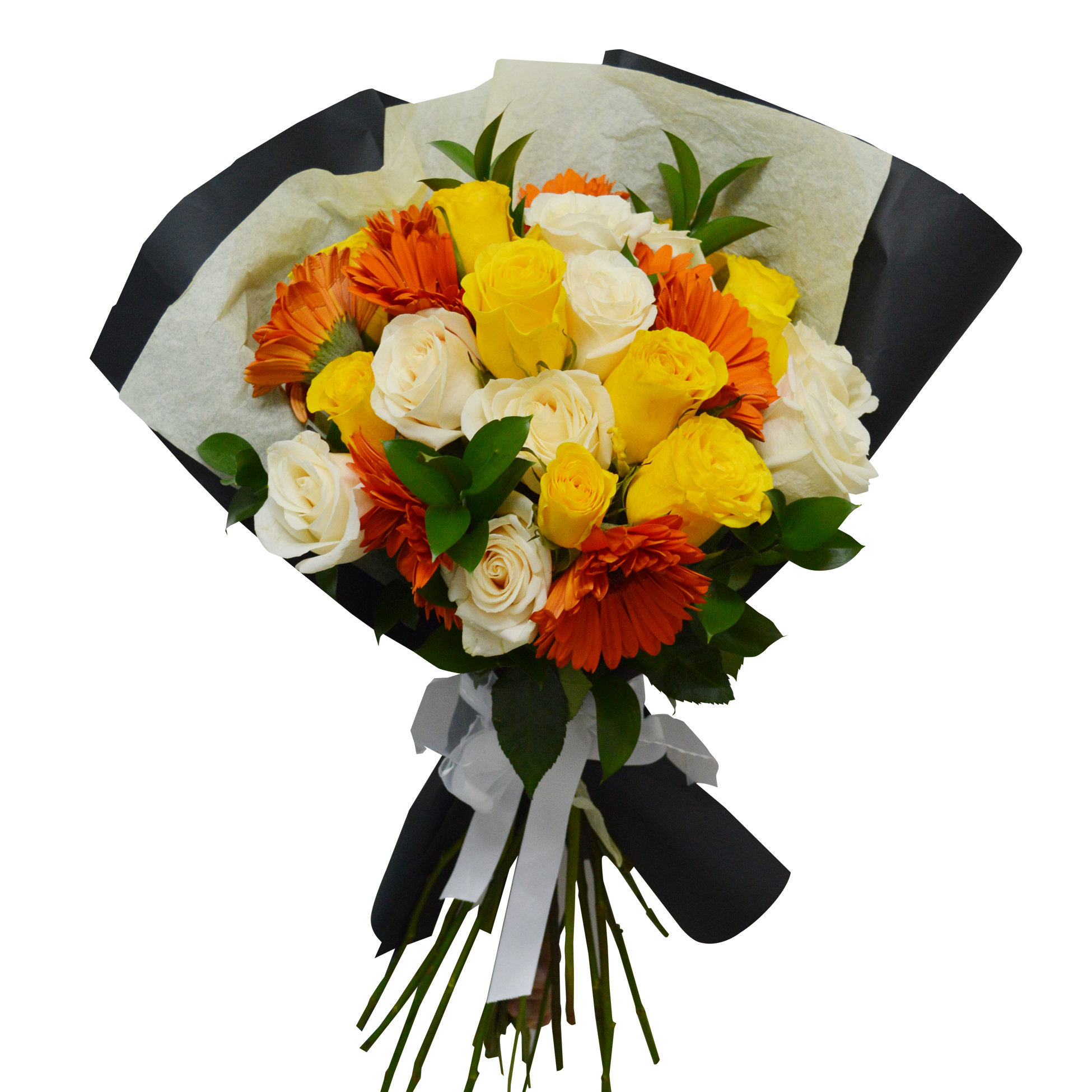 - Espectacular ramo de vivos e intensos colores. Está confeccionado con 10 Gerberas Naranjo tallo largo de Exportación, acompañadas por 10 rosas amarilla y 10 Rosas blancas Ecuantorianas de tallo largo desempinadas, mas 10 finos y duraderos ruscus como follaje, van envueltas en un delicado papel mantequilla blanco cubiertas con un grueso papel kraft negro, sujetado por una elegante cinta blanca, un instructivo de como cuidar las flores y un sobre con tarjeta para mensaje.