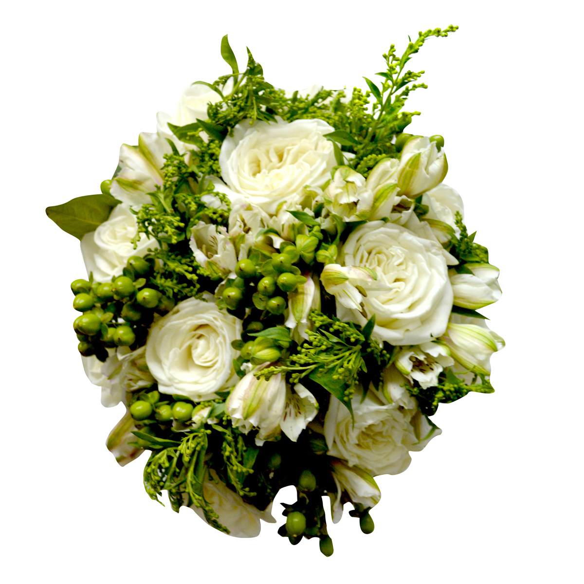 - Ramo de novia redondo confeccionado con 10 bellas Rosas Blancas Ecuatorianas, 10 Hypericum verdes, 10 Alstromerias mas 10 Solidagos, finalmente amarrado con cinta en el tono blanco y delicados alfileres blancos.