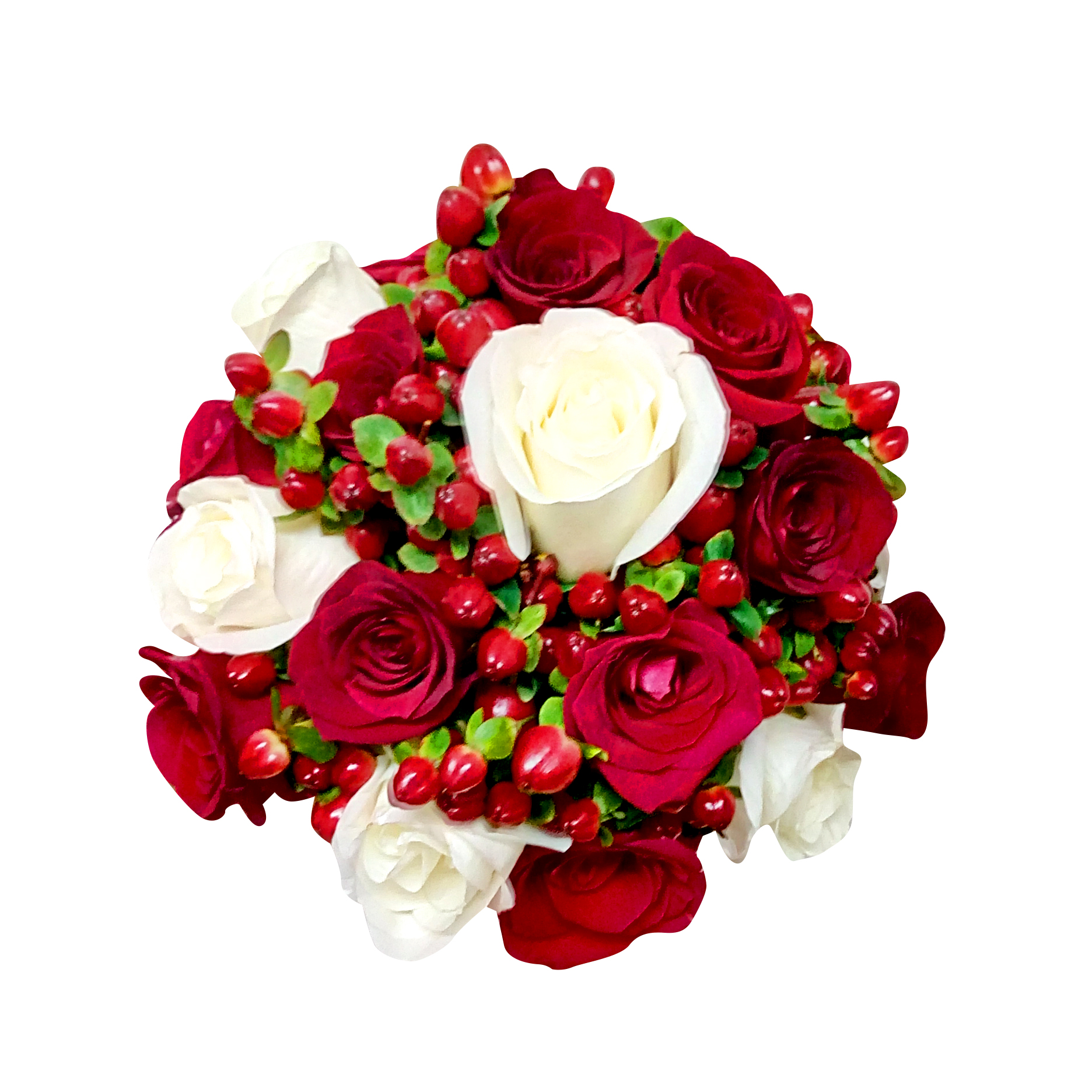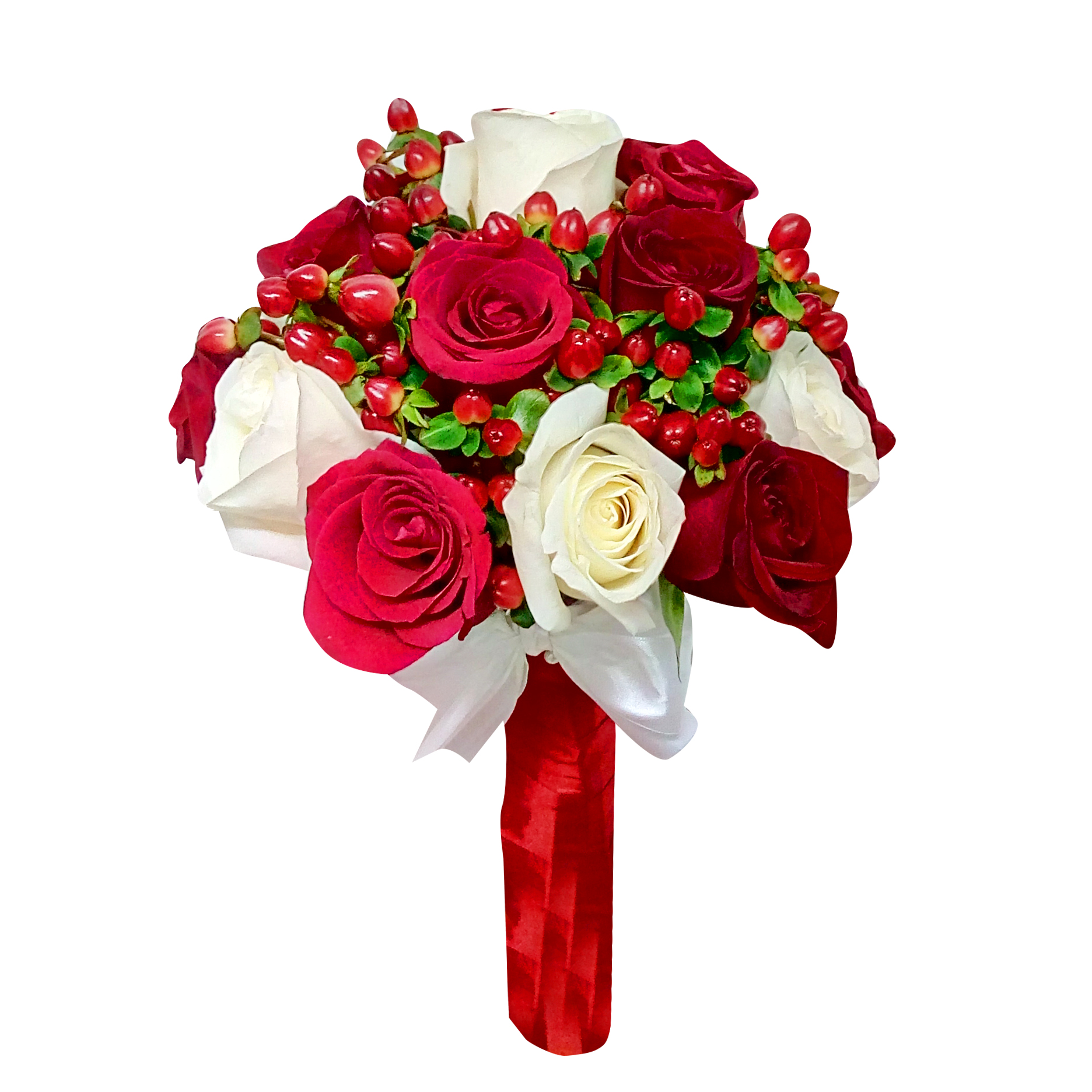 - Ramo de novia redondo confeccionado con 10 bellas Rosas rojas Ecuatorianas, 5 Rosas blancas, 10 Hypericum rojos. Finalmente amarrado con cinta Satín en el tono rojo y sujetada con un llamativo lazo color blanco.