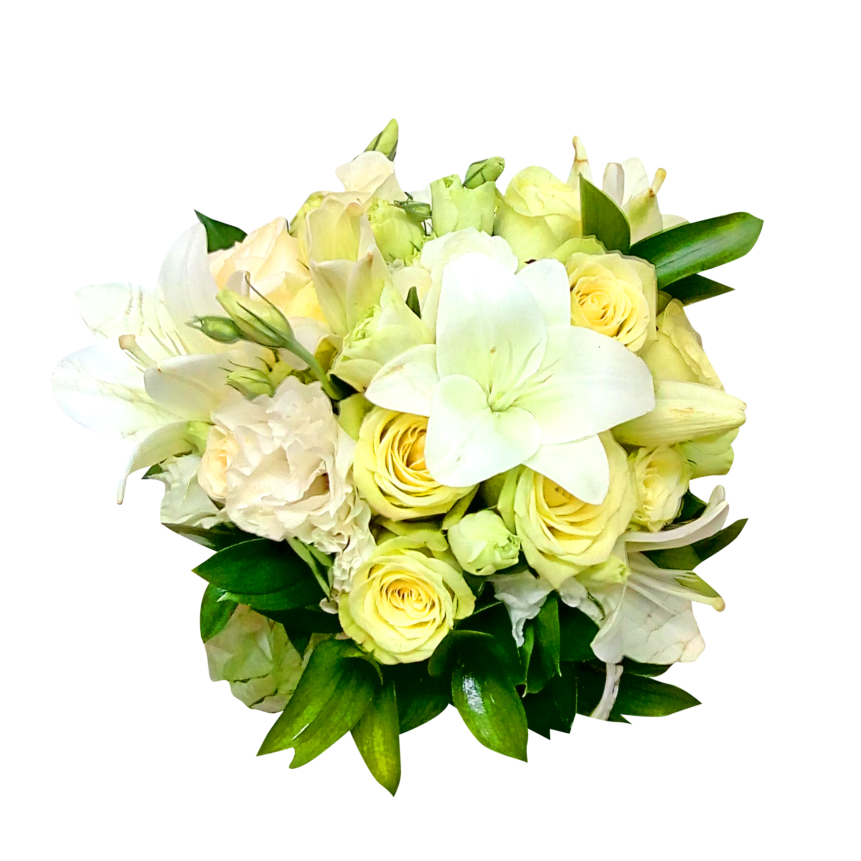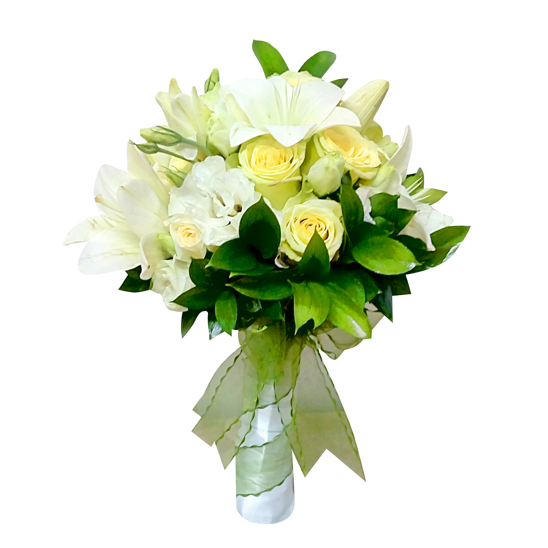 - Ramo de novia redondo confeccionado con 8 bellas Rosas blancas Ecuatorianas, 5 Lisianthus blancos, 10 Ruscus, 3 Lilium blanco. Finalmente amarrado con cinta satín en el tono blanco y sujetada con un llamativo lazo color verde.